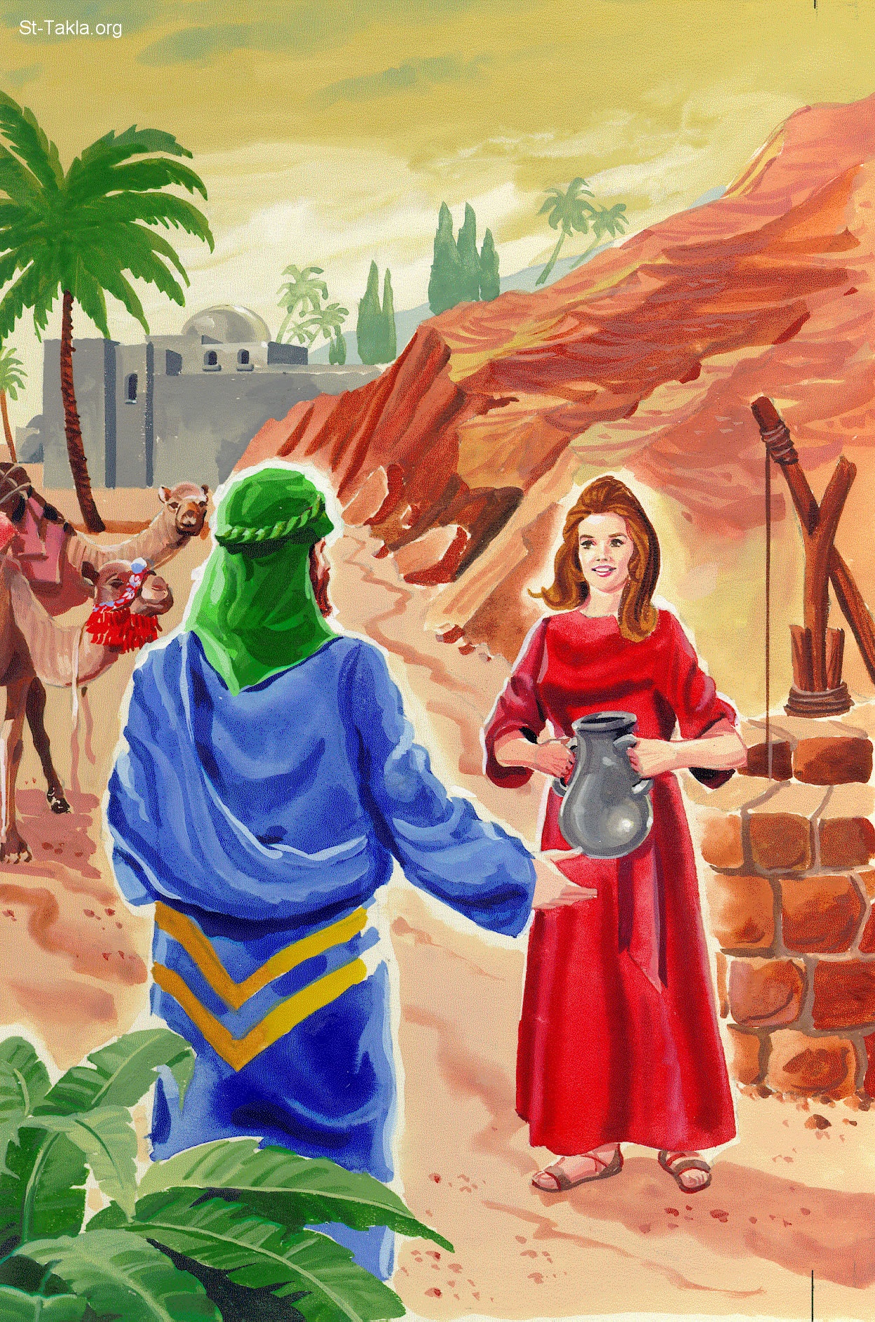 رفقه والعازر الدمشقي (عبد إبراهيم) - صلى العازر الدمشقي قائلاً: "وقال: «أيها الرب إله سيدي إبراهيم، يسر لي اليوم واصنع لطفا إلى سيدي إبراهيم. ها أنا واقف على عين الماء، وبنات أهل المدينة خارجات ليستقين ماء. فليكن أن الفتاة التي أقول لها: أميلي جرتك لأشرب، فتقول: اشرب وأنا أسقي جمالك أيضا، هي التي عينتها لعبدك إسحاق. وبها أعلم أنك صنعت لطفا إلى سيدي»" (سفر التكوين 24: 12-14) - صور الإنجيل من إن إتش بي.