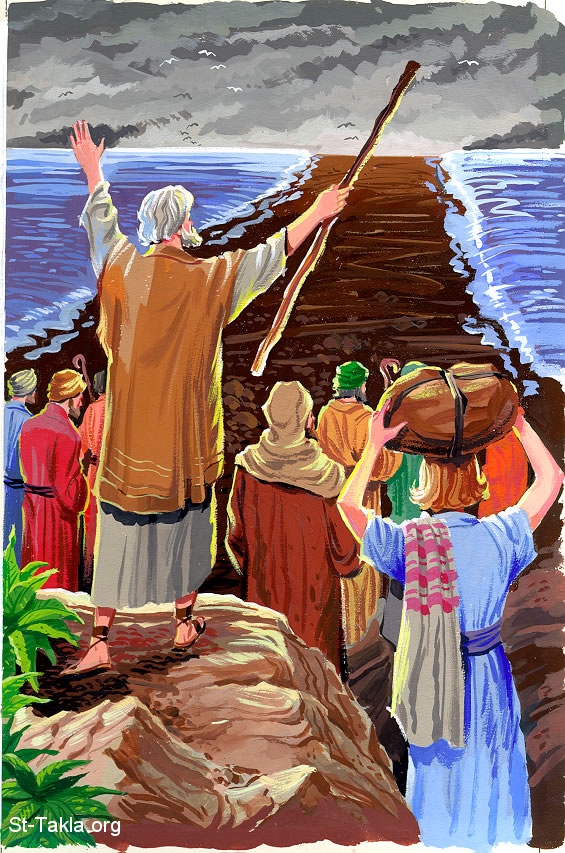 شق البحر وعبور شعب إسرائيل - "ومد موسى يده على البحر، فأجرى الرب البحر بريح شرقية شديدة كل الليل، وجعل البحر يابسة وانشق الماء. فدخل بنو إسرائيل في وسط البحر على اليابسة، والماء سور لهم عن يمينهم وعن يسارهم" (سفر الخروج 14: 21-22) - صور الإنجيل من إن إتش بي.