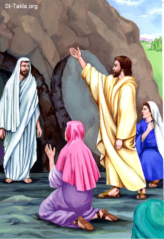 Bringing Lazarus back to life, Resurrection. - Lazarus is the brother of Mary and Martha and Jesus used to love this family. When Lazarus was ill, his sisters sent for the Lord Jesus to come to heal him but Jesus was late. When Jesus Christ arrived, Lazarus had been dead in the tomb for four days. Jesus then went to the tomb that held Lazarus' body: Jesus called in a loud voice, "Lazarus, come out!" The dead man came out after 4 days in the tomb. A lot of people believed in God because of this miracle. - Bible Clip Arts from NHP.