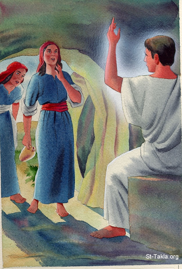 القبر فارغ – يسوع المسيح قام: "عند فجر يوم الأحد جاءت مريم المجدلية ومريم الأخرى لتنظرا القبر. فوجدا القبر فارغاً وشاهدا ملاك الرب وكان منظره كالبرق وأخبرهم عن قيامة يسوع." - صور الإنجيل من إن إتش بي.