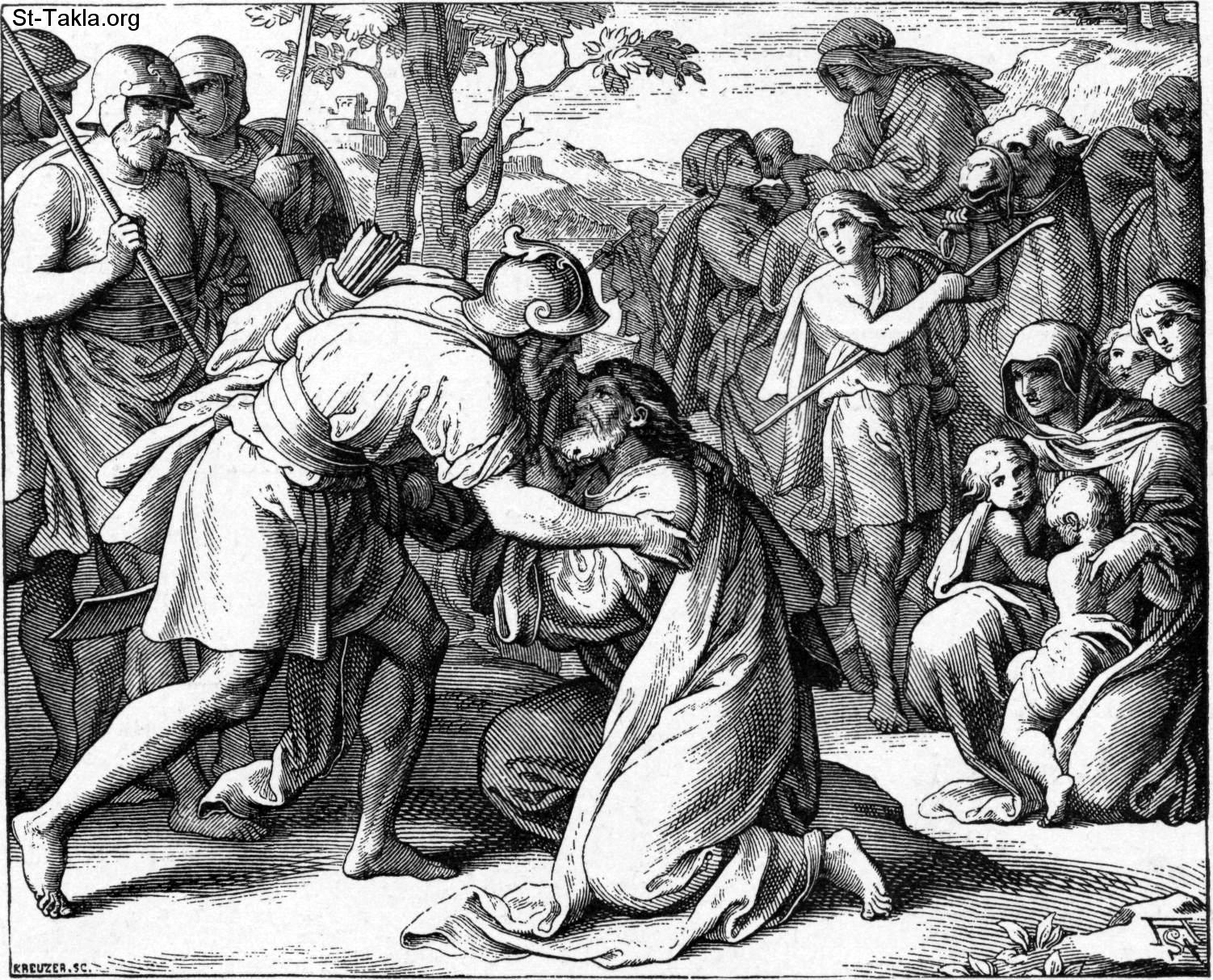 "The Meeting of Jacob and Esau", Jacob Meets His Brother Esau; caption: "Jacob meets his brother Esau. He has not seen Esau since the time when he got Esau's blessing. That was many years ago. Esau was very angry with Jacob then, and Jacob was afraid of him. And he went away from his home and lived with Laban, and took Rachel, Laban's daughter, to be his wife. Jacob has been living with Laban ever since that time. But now he wants to go back to his father's house. And Jacob is on his way back, but before he gets there he sees Esau coming toward him. Some men are with Esau, and Jacob is very much afraid. He is afraid Esau will kill him for taking away his blessing. But Esau has forgiven Jacob, and now he runs to him and puts his arms around his neck and kisses him. And they cry together because they are so glad. And Jacob gave Esau a present of some sheep and goats and camels, for Jacob had a great many of these. Afterward Esau went away to his own home, and Jacob came to his father." - from "Bible Pictures" book, by W. A. Foster, 1897.