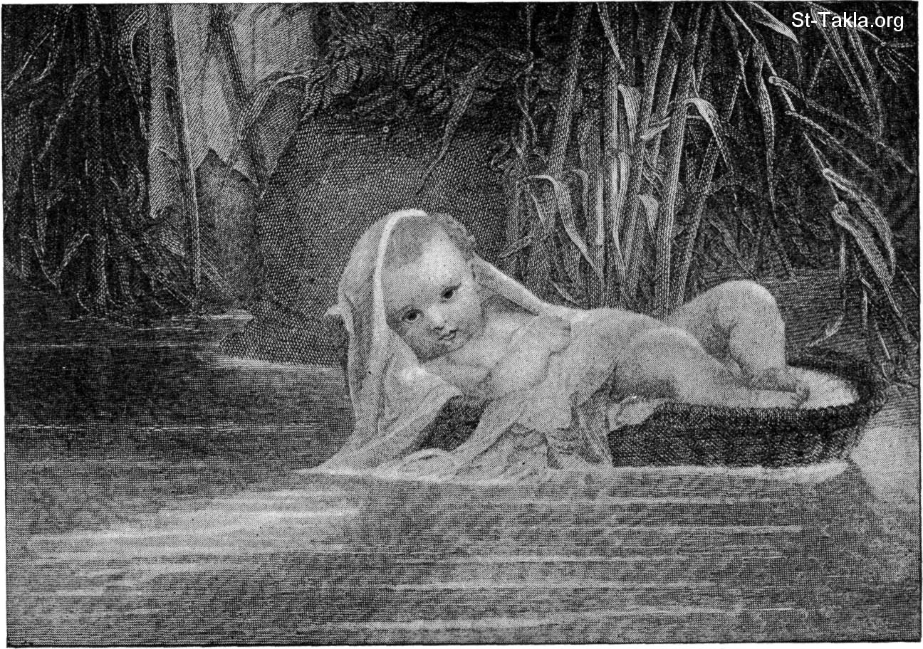 الطفل موسى يطفو فوق ماء النهر في سفط البردي المطلي بالحمر والزفت، وذلك لمنع دخول الماء داخله (الخروج 2) - من كتاب "صور الكتاب المقدس"، و. أ. فوستر، 1897 م.