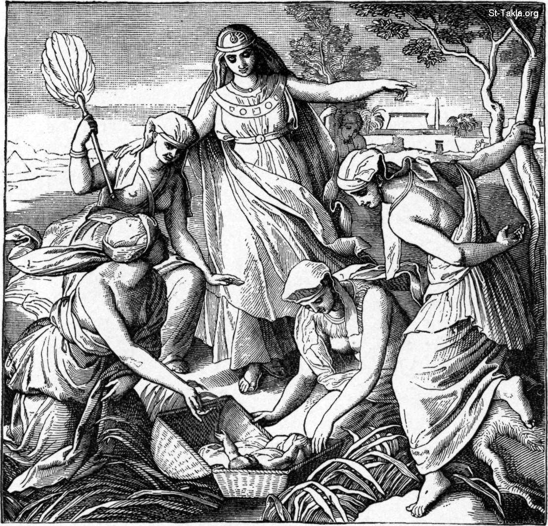 "Pharoh's Daughter Finds Moses", The King's Daughter Sees a Basket Floating in the Water. Caption: "The king's daughter is walking beside the river. She sees a basket floating in the water. She sends a young woman to get it. They open the basket and find a little baby in it. The baby cries, and the king's daughter pities it. She takes it to her home and calls its name Moses, and she says that Moses shall be her son." - from "Bible Pictures" book, by W. A. Foster, 1897.