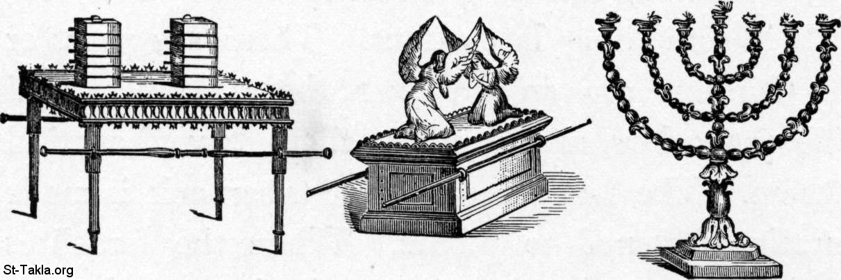 "Table of Shew Bread, Ark, Golden Candlestick", Things that Were Made To Go into the Tabernacle. Caption: "These are some of the things that were made to go into the tabernacle. They are all very beautiful. The table is made of gold. It has twelve loaves of bread on it called shew-bread. There is a golden box too ; it is called the ark. It has two angels on its lid. The angels are made out of pure gold. And there is a golden candlestick, to burn and give light, inside of the tabernacle." - from "Bible Pictures" book, by W. A. Foster, 1897.