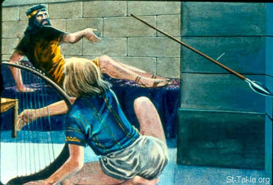 And it happened on the next day that the distressing spirit from God came upon Saul, and he prophesied inside the house. So David played music with his hand, as at other times; but there was a spear in Saul's hand. And Saul cast the spear, for he said, "I will pin David to the wall!" But David escaped his presence twice. (1 Samuel 18:10-11)