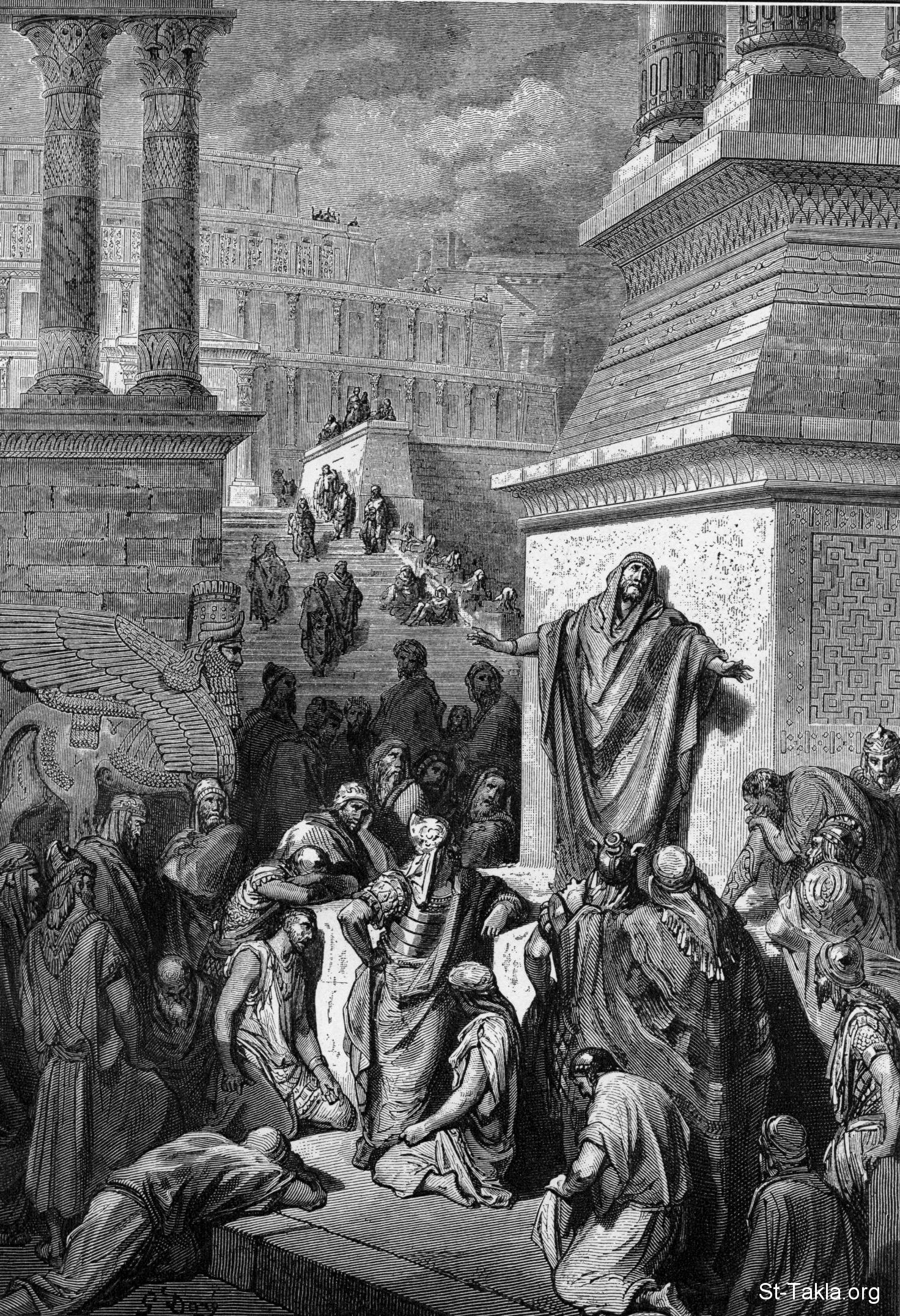 يونان النبي يعظ في نينوى (يو 3: 4) - رسم الفنان جوستاف دوريه - من كتاب "الإنجيل وقصته"، إصدار تشارلز هورن، 1909 م.