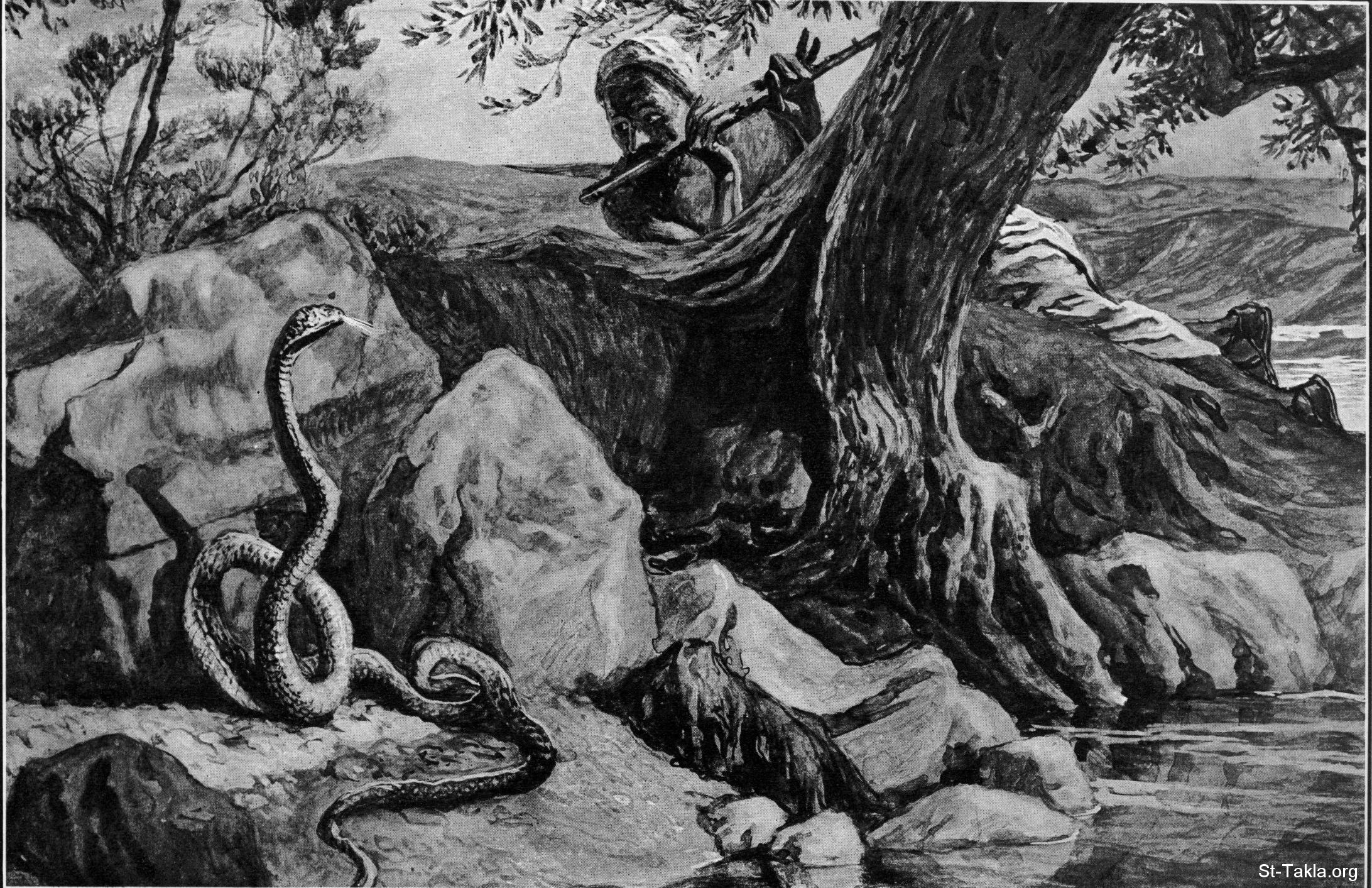 ترويض الأفعى: سحر الأفاعي، رقي الحية - من كتاب "الإنجيل وقصته"، إصدار تشارلز هورن، 1909 م.