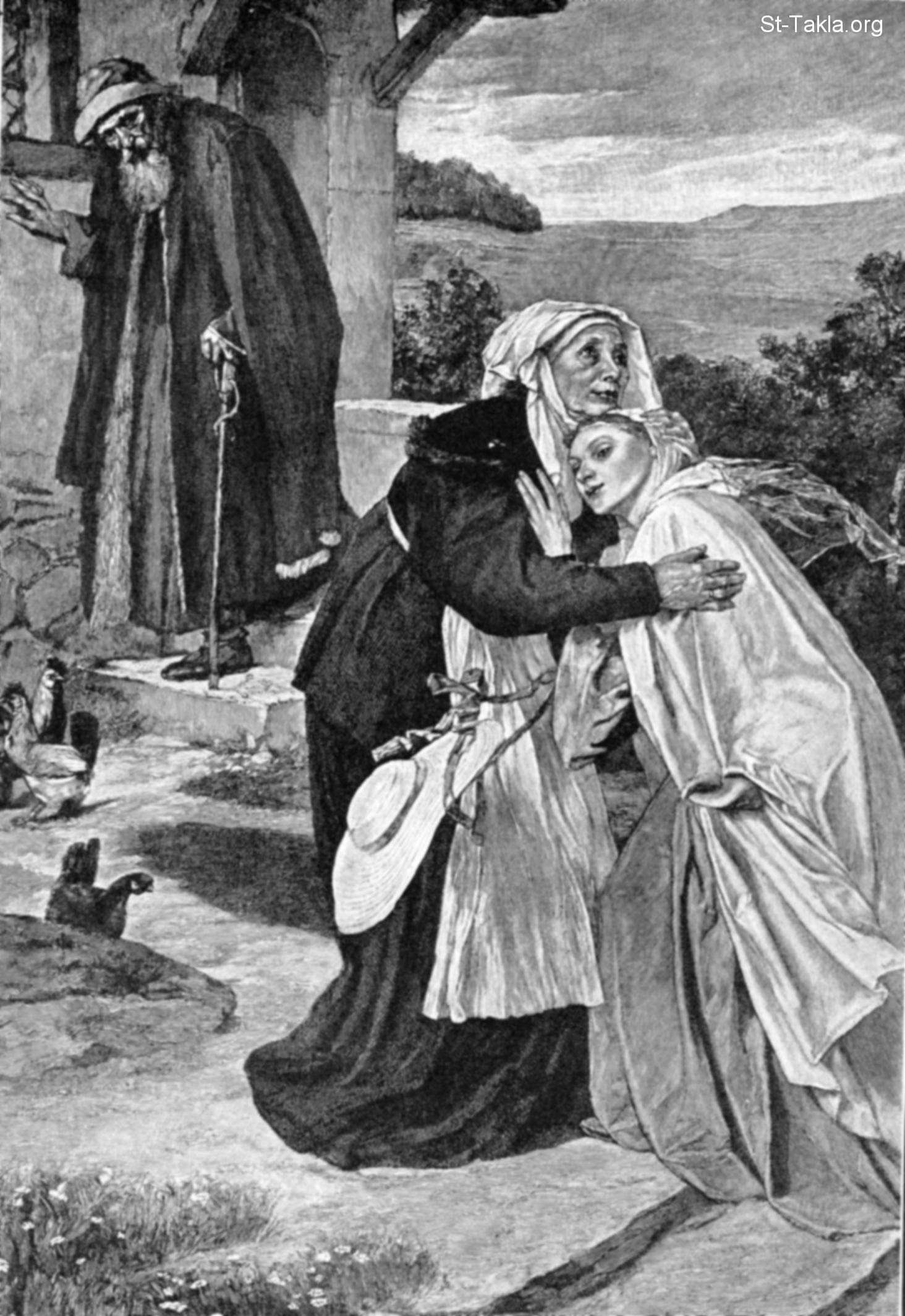 لقاء القديسة العذراء مريم مع القديسة أليصابات (لوقا 1: 42)، رسم الفنان لويس فيلدمان - من كتاب "الإنجيل وقصته"، إصدار تشارلز هورن، 1909 م.
