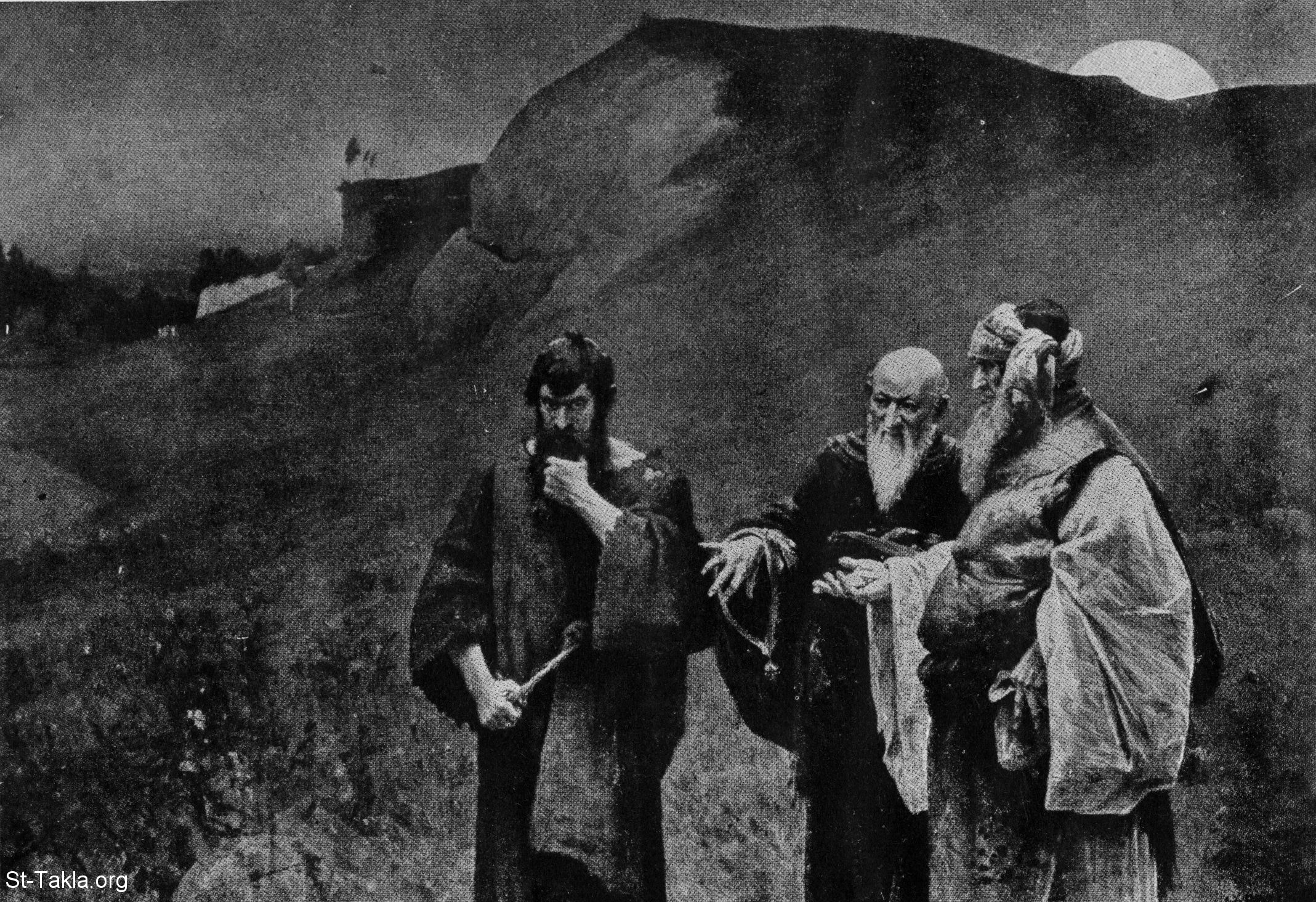يهوذا الإسخريوطي مع الكهنة - من كتاب "الإنجيل وقصته"، إصدار تشارلز هورن، 1909 م.