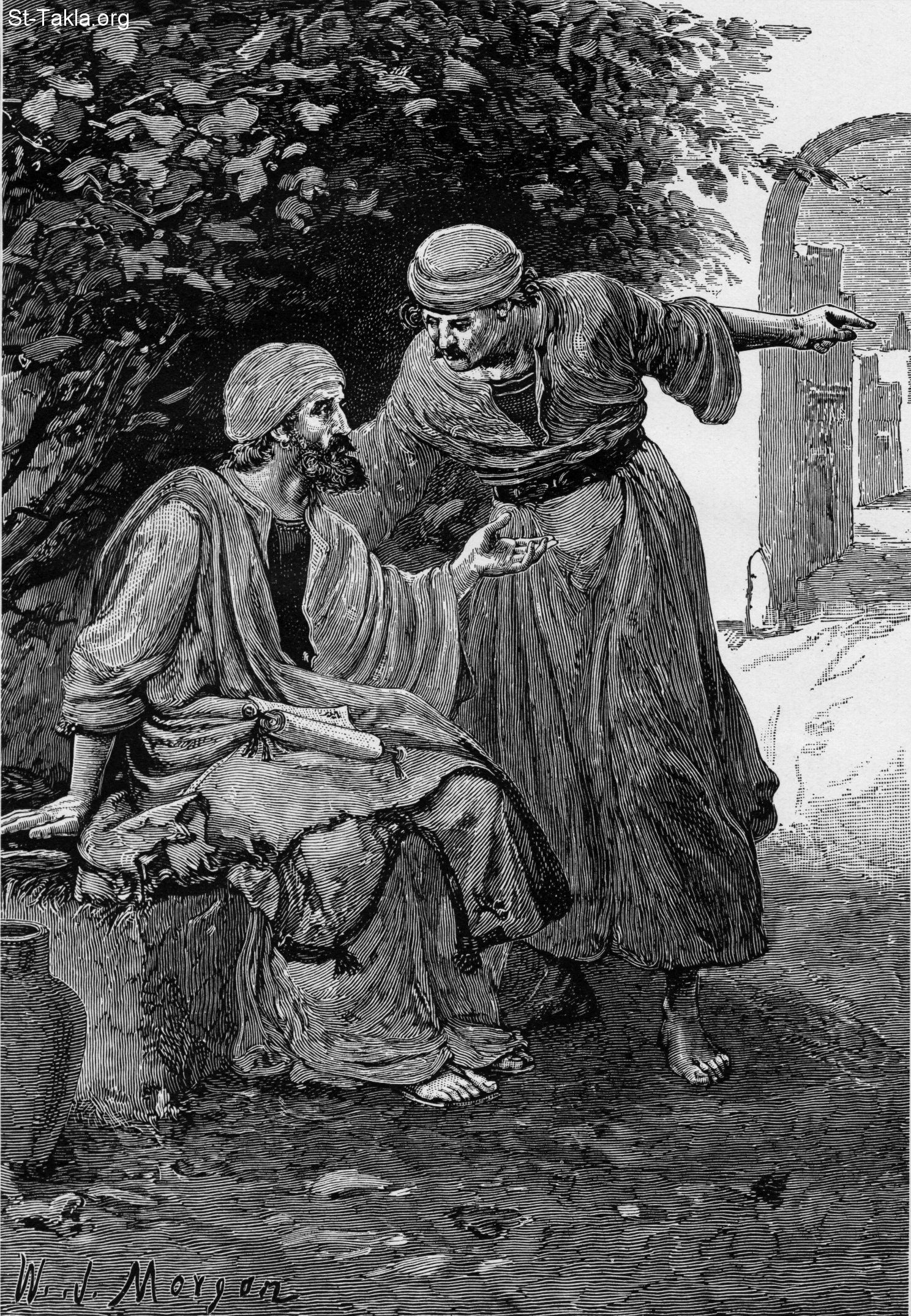 فيلبس ونثنائيل (يوحنا 1: 46)، رسم و. ج. مورجون - من كتاب "الإنجيل وقصته"، إصدار تشارلز هورن، 1909 م.