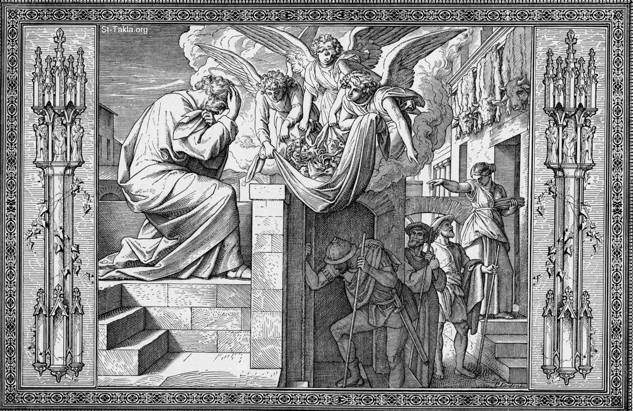 رؤيا بطرس وملاءة الأطعمة، علامة قبول الأمم. ويظهر في يمين الصورة العسكري وخادما كرنيليوس الذين أمرهم بالذهاب ليافا لإحضار بطرس الرسول وهم يسألون عن مكانه (أعمال 10) - رسم الفنان بيتر شنور - من كتاب "الإنجيل وقصته"، إصدار تشارلز هورن، 1909 م.