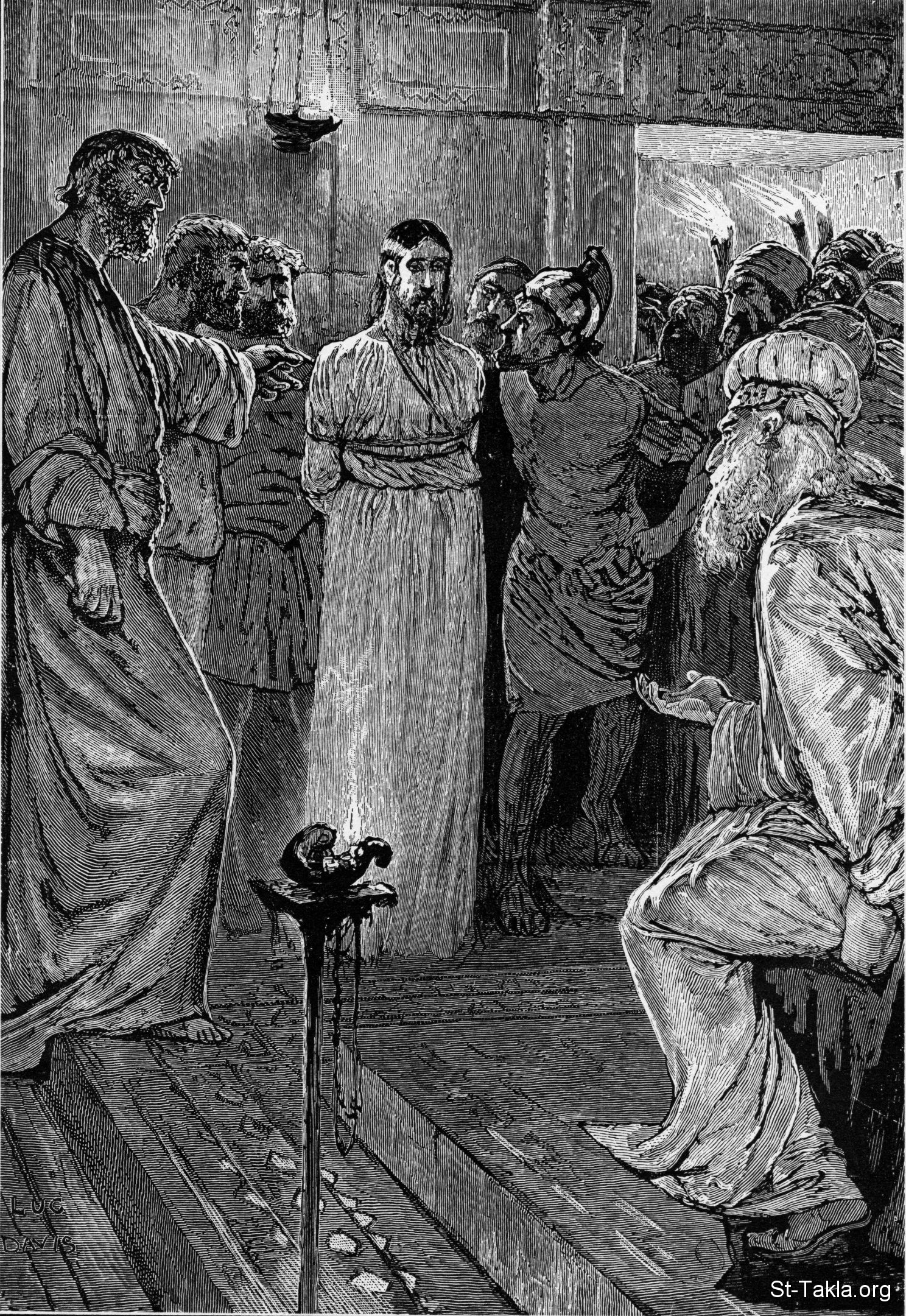يسوع المسيح أمام قيافا: "وكان رؤساء الكهنة والمجمع كله يطلبون شهادة على يسوع ليقتلوه، فلم يجدوا. لأن كثيرين شهدوا عليه زورا، ولم تتفق شهاداتهم" (مرقس 14: 55-56)، رسم لوك. ديفيز - من كتاب "الإنجيل وقصته"، إصدار تشارلز هورن، 1909 م.