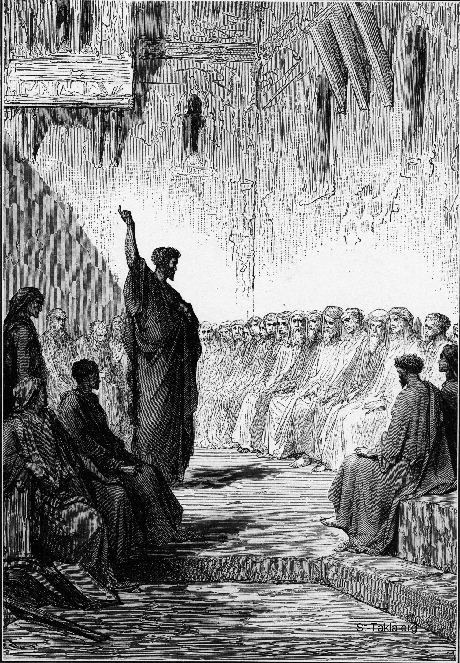 القديس بولس الرسول يعظ أهل تسالونيكي، للفنان جوستاف دوريه. ويظهر بولس يعزيهم ويوضح لهم حتمية المجيء الثاني: "لأنهم هم يخبرون عنا، أي دخول كان لنا إليكم، وكيف رجعتم إلى الله من الأوثان، لتعبدوا الله الحي الحقيقي، وتنتظروا ابنه من السماء، الذي أقامه من الأموات، يسوع، الذي ينقذنا من الغضب الآتي." (تسالونيكي الأولى 1: 9-10). - من كتاب "الإنجيل وقصته"، إصدار تشارلز هورن، 1909 م.