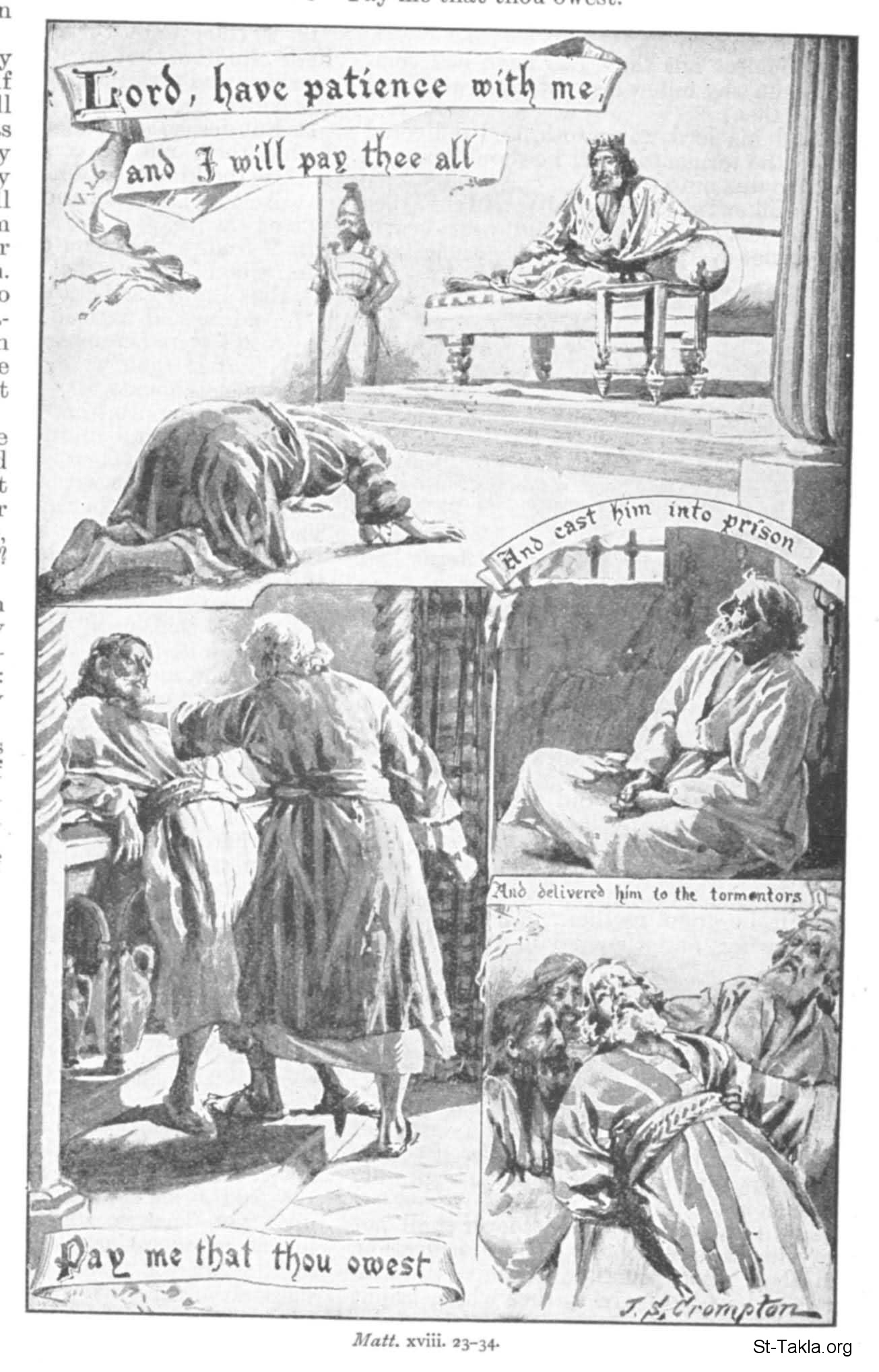 "ولما خرج ذلك العبد وجد واحدا من العبيد رفقائه، كان مديونا له بمئة دينار، فأمسكه وأخذ بعنقه قائلا: أوفني ما لي عليك." (متى 18: 28). - للفنان جيمز شو كرومبتون.