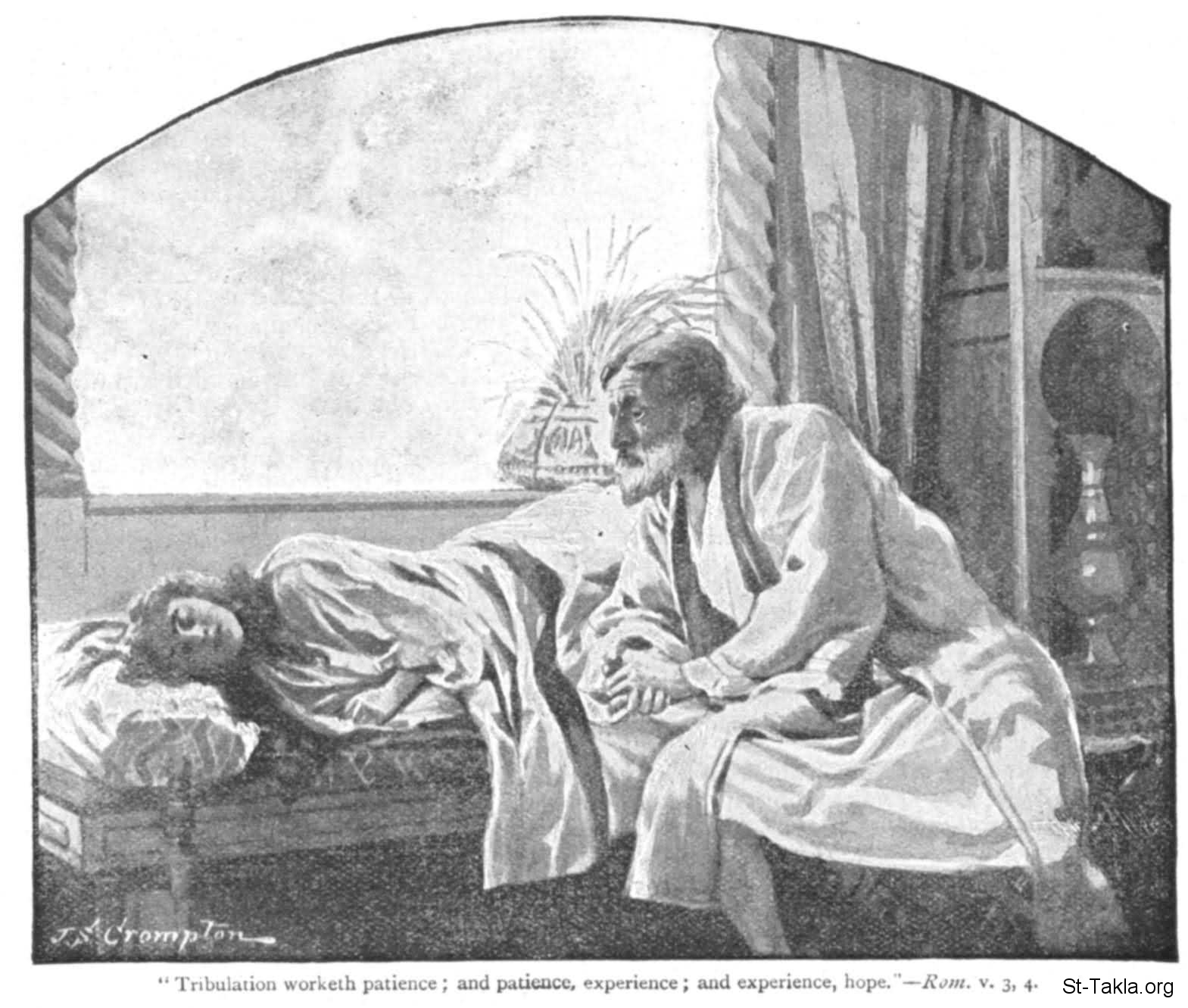 رجل بجانب امرأة مريضة: "نفتخر أيضا في الضيقات، عالمين أن الضيق ينشئ صبرا، والصبر تزكية، والتزكية رجاء، والرجاء لا يخزي" (رومية 5: 3-5) - للفنان جيمز شو كرومبتون.