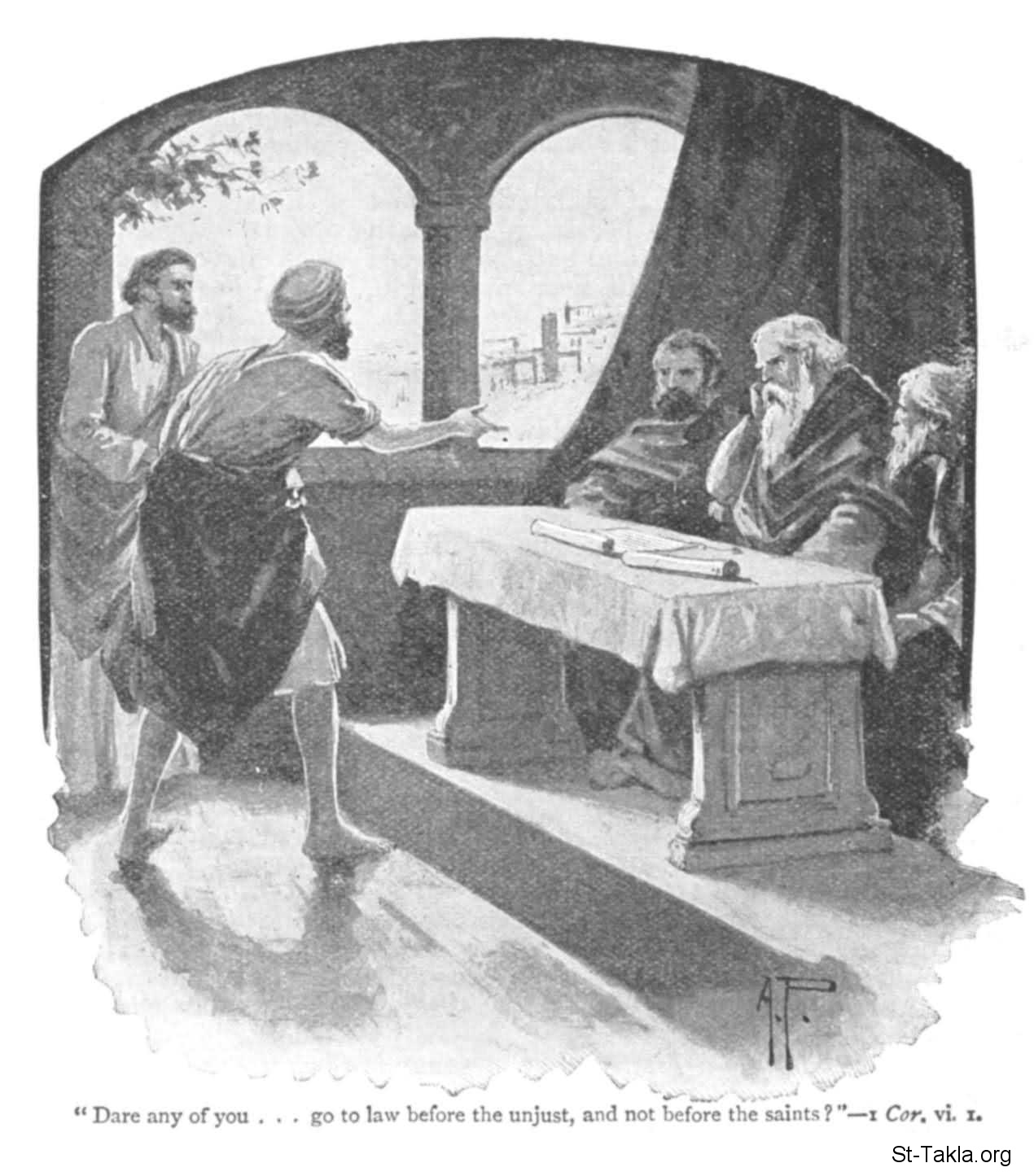 "أيتجاسر منكم أحد له دعوى على آخر أن يحاكم عند الظالمين، وليس عند القديسين؟" (كورنثوس الأولى 6: 1). - للفنان إيه بي.