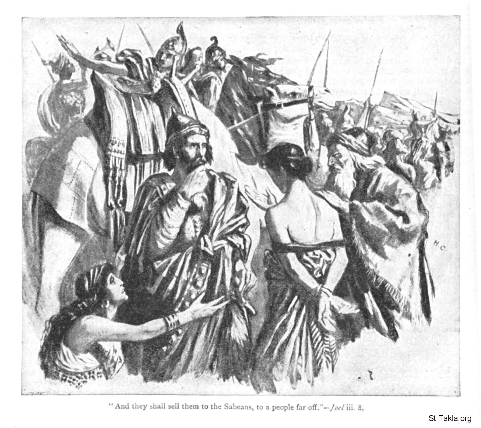 "وأبيع بنيكم وبناتكم بيد بني يهوذا ليبيعوهم للسبائيين" (يوئيل 3: 8) - رسم الفنان إتش. سي.