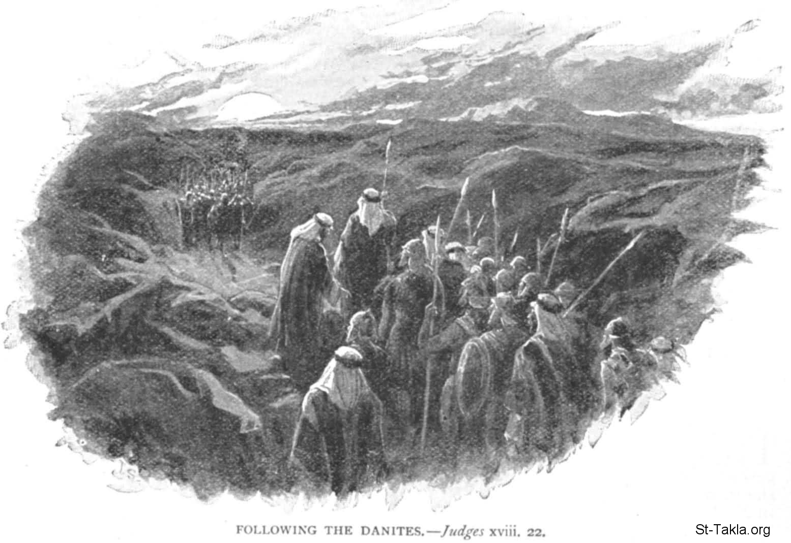 على إثر الدانيين: سبط دان: "ولما ابتعدوا عن بيت ميخا اجتمع الرجال الذين في البيوت التي عند بيت ميخا وأدركوا بني دان" (القضاة 18: 22) - لفنان غير معروف.