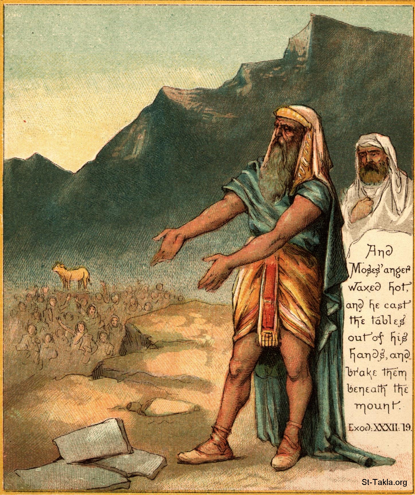 موسى يحطم لوحى الشريعة: فحمي غضب موسى وطرح اللوحين من يديه وكسرهما في اسفل الجبل. (خروج 32: 19) - من كتاب "الكتاب المقدس الملون المصور للأطفال"، إصدار سوك لنشر المسيحية، 1900 م.