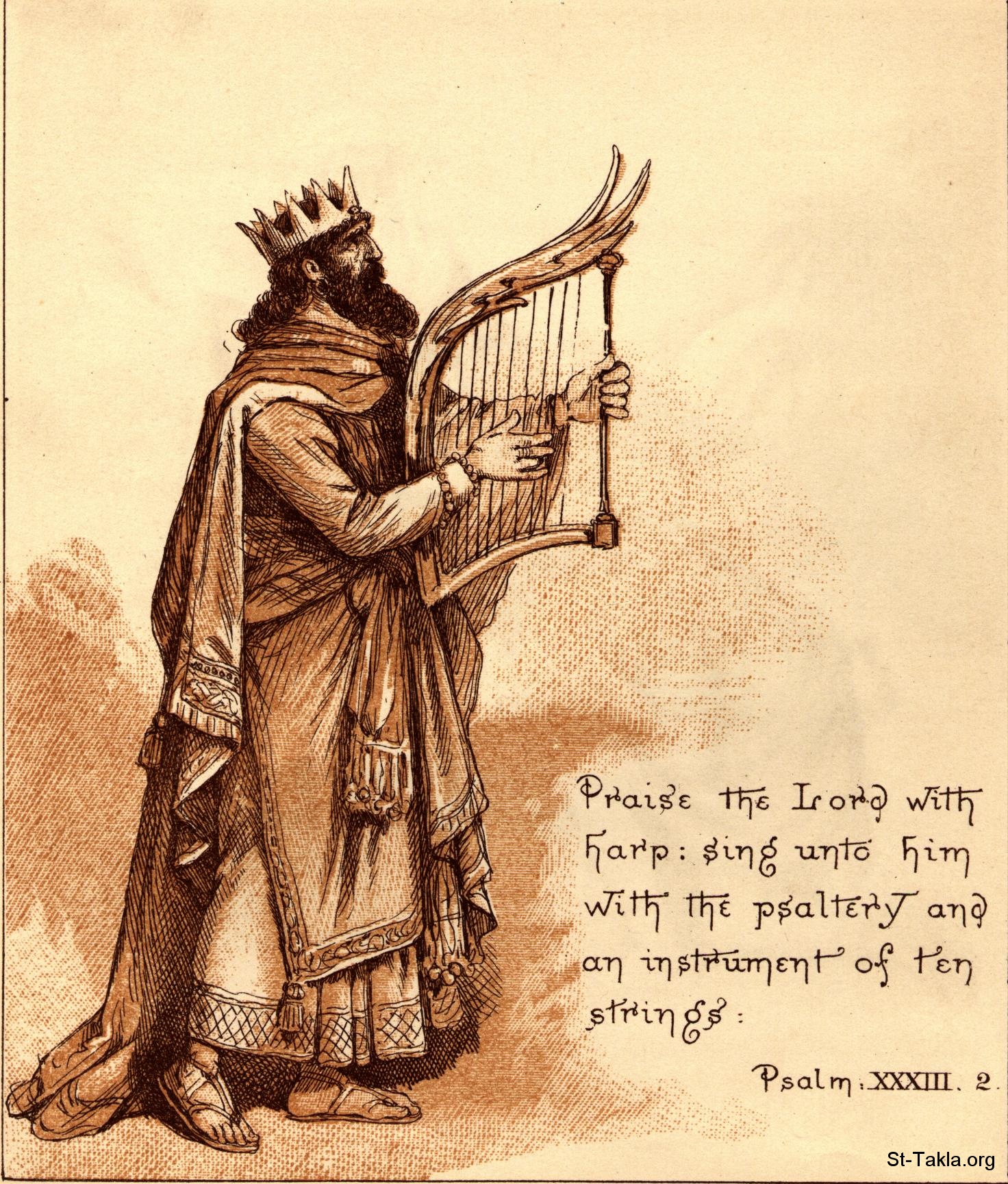 "احمدوا الرب بالعود. بربابة ذات عشرة أوتار رنموا له" (مزامير 33: 2) - داود النبي والملك - من كتاب "الكتاب المقدس الملون المصور للأطفال"، إصدار سوك لنشر المسيحية، 1900 م.