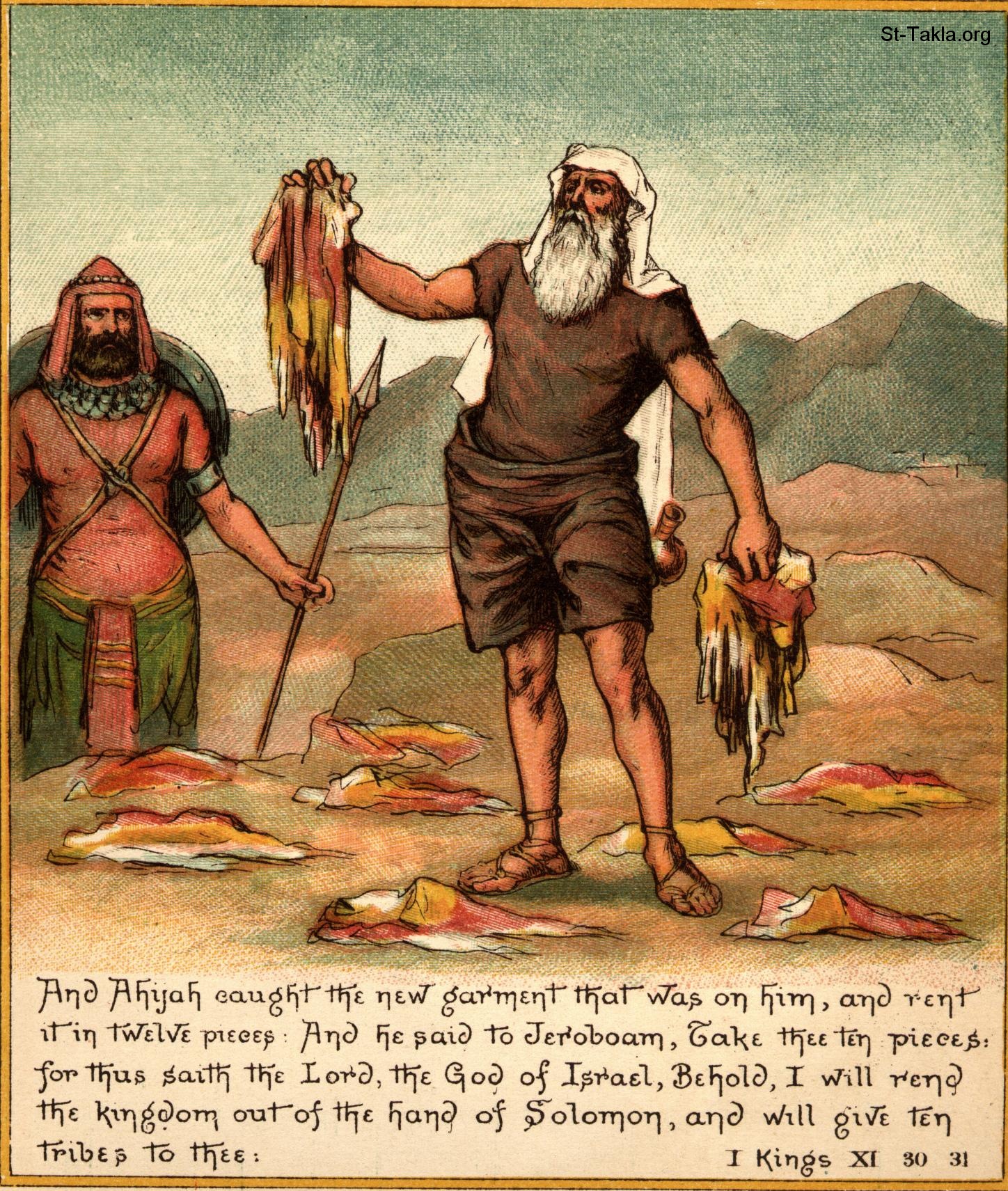 تمزق المملكة: فقبض أخيا على الرداء الجديد الذي عليه ومزقه اثنتي عشرة قطعة وقال ليربعام: خذ لنفسك عشر قطع، لأنه هكذا قال الرب إله إسرائيل: هأنذا أمزق المملكة من يد سليمان وأعطيك عشرة أسباط (ملوك أول 11: 30, 31) - من كتاب "الكتاب المقدس الملون المصور للأطفال"، إصدار سوك لنشر المسيحية، 1900 م.