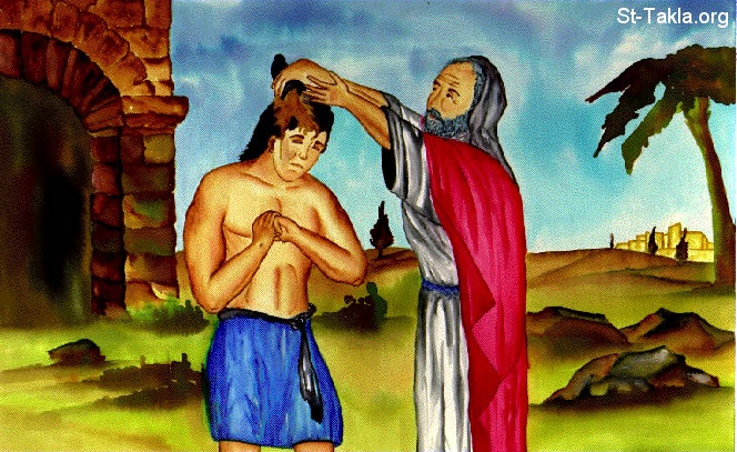 صموئيل يمسح داود ملكًا (صموئيل الأول 16) - من صور كتاب توصيل المسيح، بوجوتا، كولومبيا.
