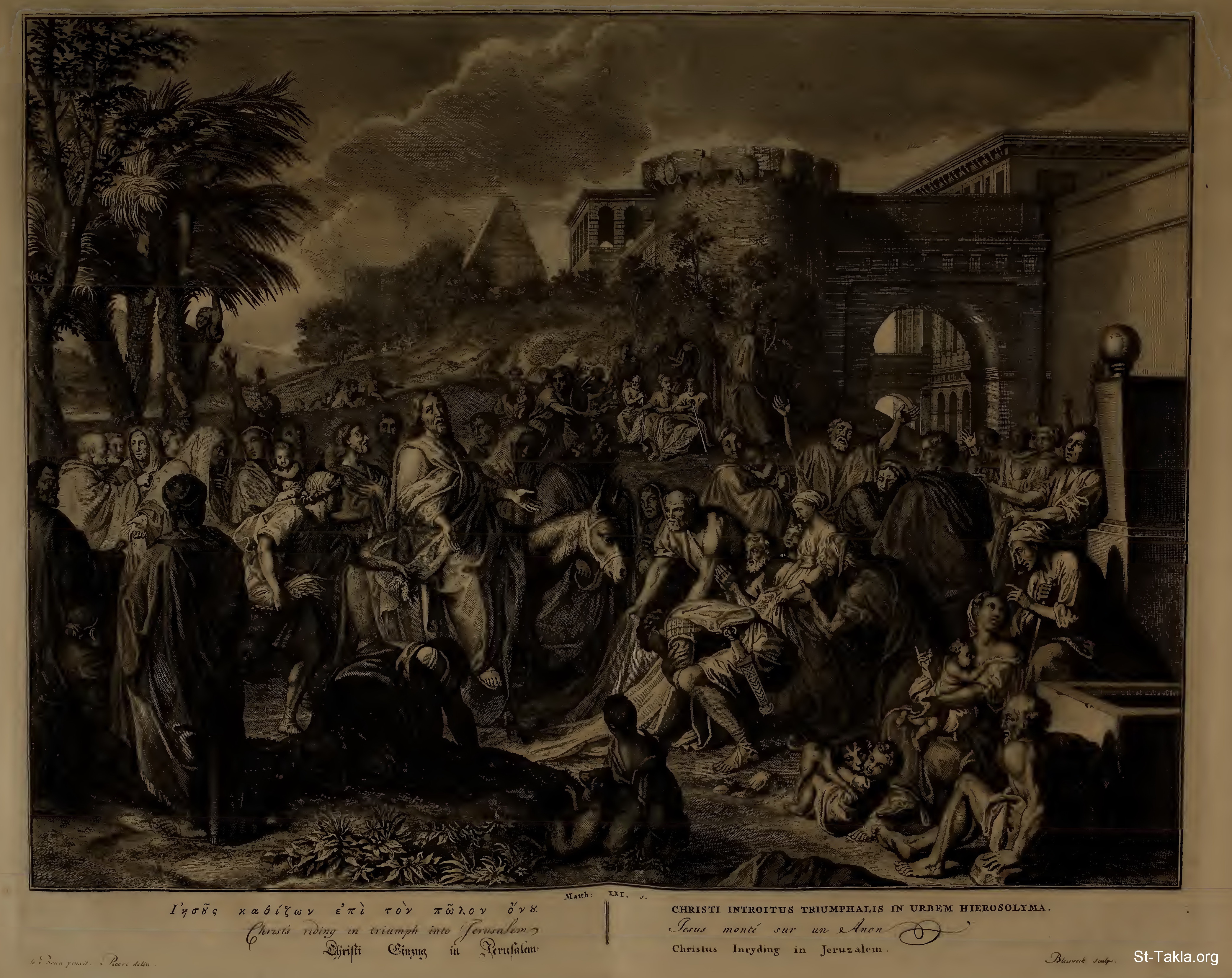 Christ riding in triumph into Jerusalem. : All this was done, that it might be fulfilled which was spoken by the prophet, saying, Tell ye the daughter of Sion, Behold, thy King cometh unto thee, meek, and sitting upon an ass, and a colt the foal of an ass. And the disciples went, and did as Jesus commanded them, and brought the ass, and the colt, and put on them their clothes, and they set him thereon. (Matthew 21:4-7 ) - from "Figures de la Bible" book, 1728.