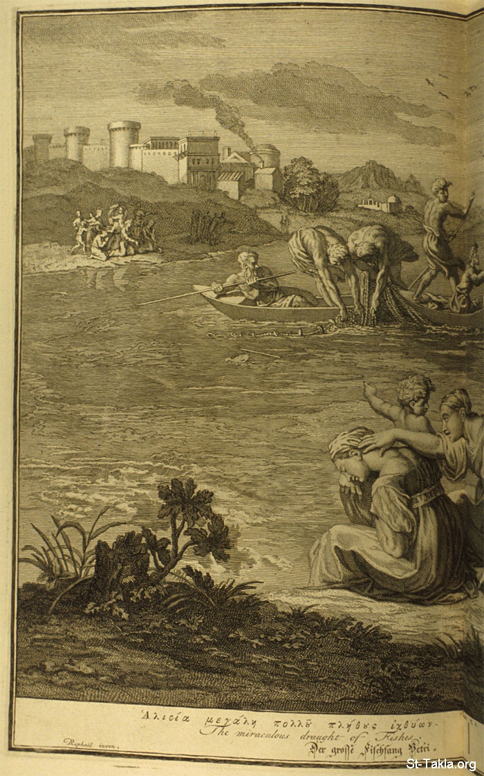 The miraculous draught of Fishes. : Now when he had left speaking, he said unto Simon, Launch out into the deep, and let down your nets for a draught. And Simon answering said unto him, Master we have toiled all the night, and have taken nothing: nevertheless at thy word I will let down the net. And when they had this done, they inclosed a great multitude of fishes: and their net brake. And they beckoned unto their partners, which were in the other ship, that they should come and help them. And they came, and filled both the ships, so that they began to sink. When Simon Peter saw it, he fell down at Jesus' knees, saying, Depart from me; for I am a sinful man, O Lord. For he was astonished, and all that were with him, at the draught of the fishes which they had taken. (Luke 5:4-9) - from "Figures de la Bible" book, 1728.