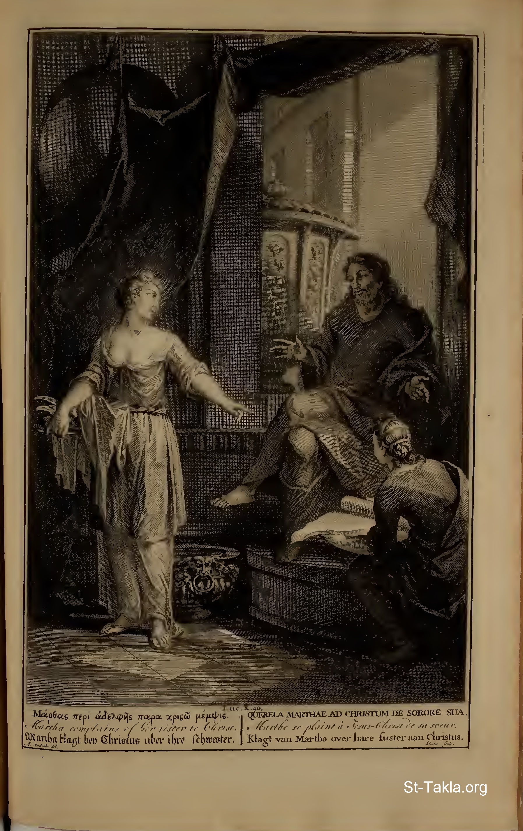 Martha complains of her sister to Christ. : Now it came to pass, as they went, that he entered into a certain village: and a certain woman named Martha received him into her house. And she had a sister called Mary, which also sat at Jesus' feet, and heard his word. But Martha was cumbered about much serving, and came to him, and said, Lord, dost thou not care that my sister hath left me to serve alone? bid her therefore that she help me. And Jesus answered and said unto her, Martha, Martha, thou art careful and troubled about many things: but one thing is needful: and Mary hath chosen that good part, which shall not be taken away from her. (Luke 10:40) - from "Figures de la Bible" book, 1728.
