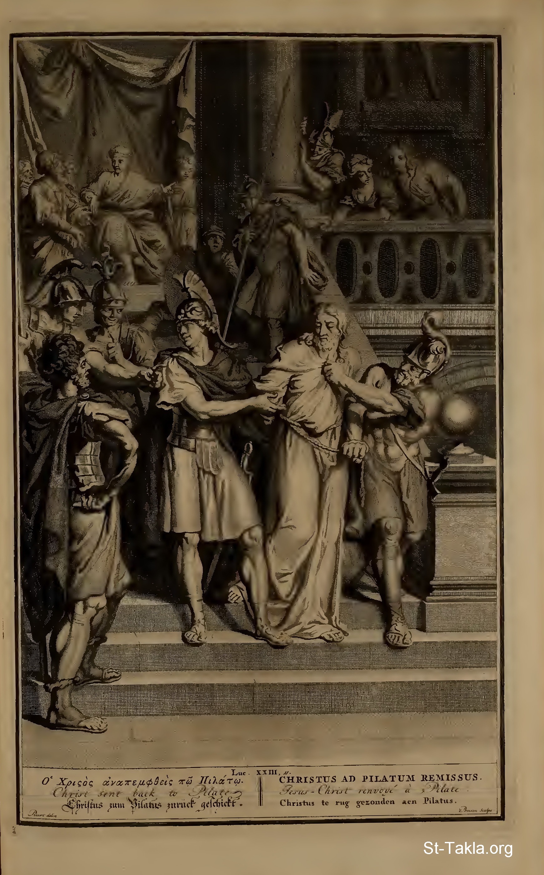 إعادة إرسال السيد السيد المسيح لمحاكمته أمام بيلاطس البنطي، وهيرودس والجنود يستهزأون به، ويلبسونه الرداء القرمزي (لوقا 23: 37) (صورة 2) - من كتاب "صور كتابية"، 1728 م.