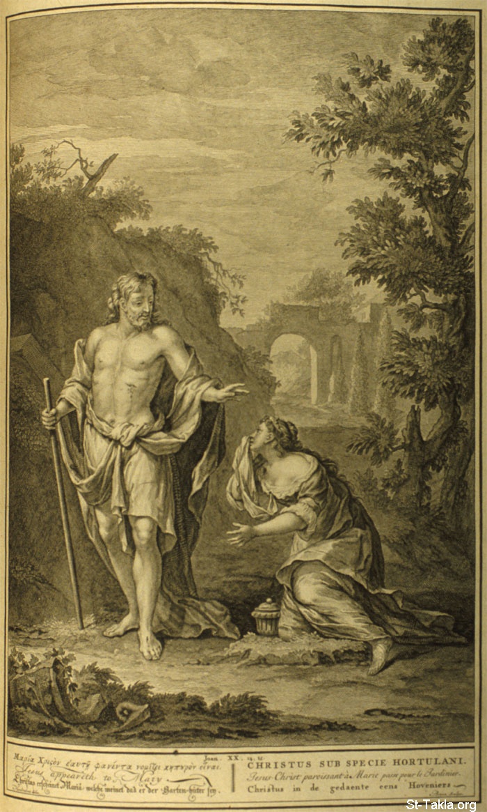 Jesus appeareth to Mary : And when she had thus said, she turned herself back, and saw Jesus standing, and knew not that it was Jesus. Jesus saith unto her, Woman, why weepest thou? whom seekest thou? She, supposing him to be the gardener, saith unto him, Sir, if thou have borne him hence, tell me where thou hast laid him, and I will take him away. Jesus saith unto her, Mary. She turned herself, and saith unto him, Rabboni; which is to say, Master. (John 20:14-16 ) - from "Figures de la Bible" book, 1728.