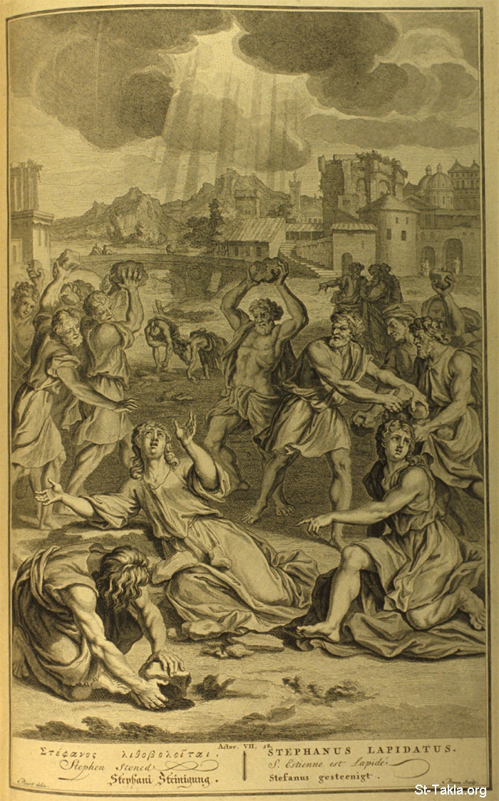 Stephen stoned : Then they cried out with a loud voice, and stopped their ears, and ran upon him with one accord, and cast him out of the city, and stoned him: and the witnesses laid down their clothes at a young man's feet, whose name was Saul. And they stoned Stephen calling upon God, and saying, Lord Jesus, receive my spirit. (Acts 7:57-59) - from "Figures de la Bible" book, 1728.