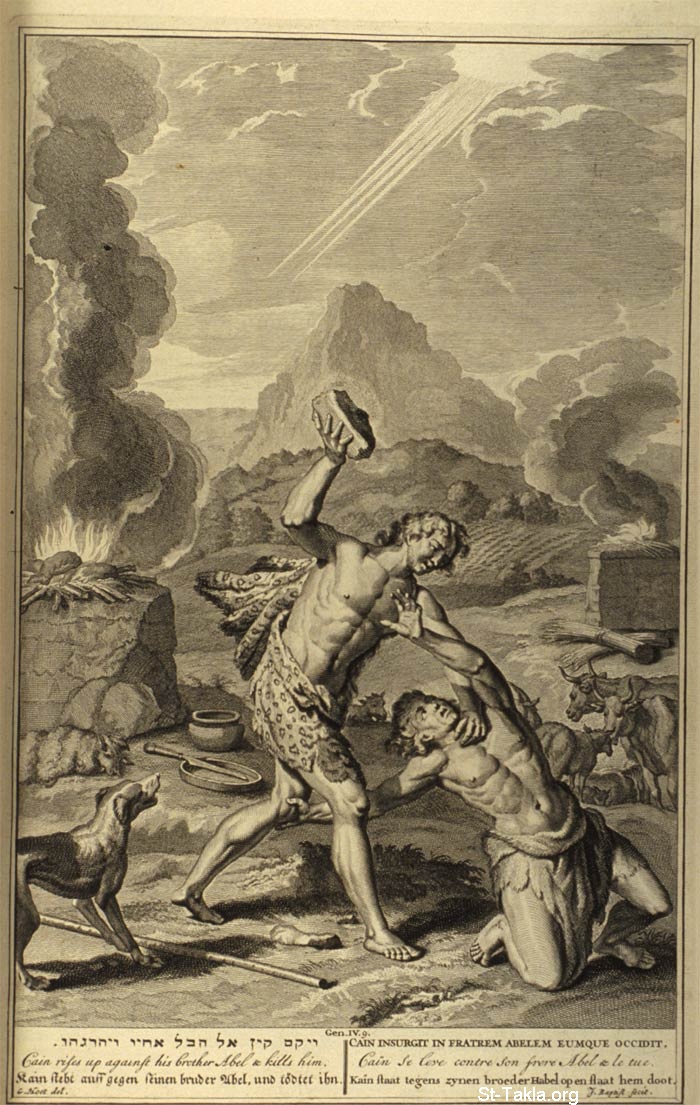 قايين يقوم على أخيه هابيل ويقتله: "وكلم قايين هابيل أخاه. وحدث إذ كانا في الحقل أن قايين قام على هابيل أخيه وقتله" (التكوين 4: 8) - من كتاب "صور كتابية"، 1728 م.