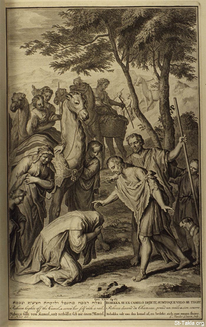 Rebecca lights off the Camel, and covers her self with a vail.: And Rebekah lifted up her eyes, and when she saw Isaac, she lighted off the camel. For she had said unto the servant, What man is this that walketh in the field to meet us? And the servant had said, It is my master: therefore she took a veil, and covered herself. And the servant told Isaac all things that he had done. And Isaac brought her into his mother Sarah's tent, and took Rebekah, and she became his wife; and he loved her: and Isaac was comforted after his mother's death. (Genesis 24:64-67) - from "Figures de la Bible" book, 1728.