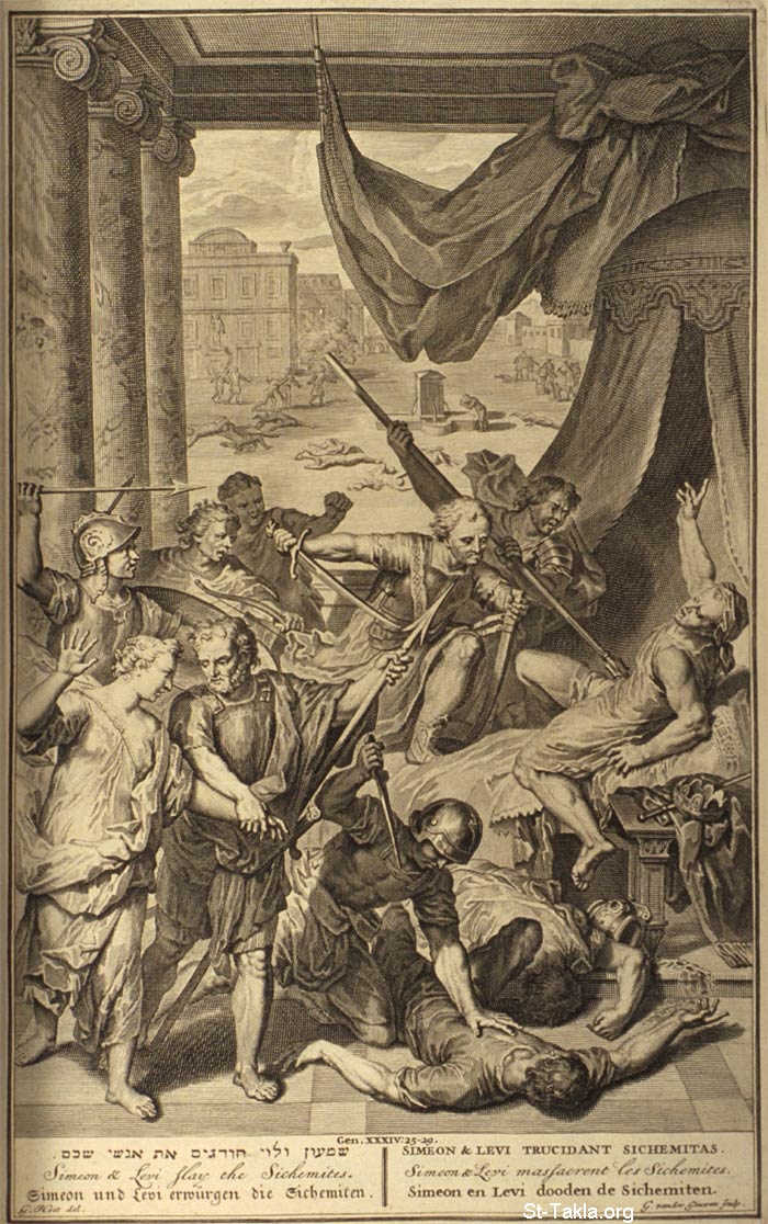 شمعون ولاوي أخوي دينة يقتلان بني شكيم: "فحدث في اليوم الثالث إذ كانوا متوجعين أن ابني يعقوب، شمعون ولاوي أخوي دينة، أخذا كل واحد سيفه وأتيا على المدينة بأمن وقتلا كل ذكر. وقتلا حمور وشكيم ابنه بحد السيف، وأخذا دينة من بيت شكيم وخرجا. ثم أتى بنو يعقوب على القتلى ونهبوا المدينة، لأنهم نجسوا أختهم. غنمهم وبقرهم وحميرهم وكل ما في المدينة وما في الحقل أخذوه. وسبوا ونهبوا كل ثروتهم وكل أطفالهم، ونساءهم وكل ما في البيوت" (التكوين 34: 25-29) (صورة 1) - من كتاب "صور كتابية"، 1728 م.
