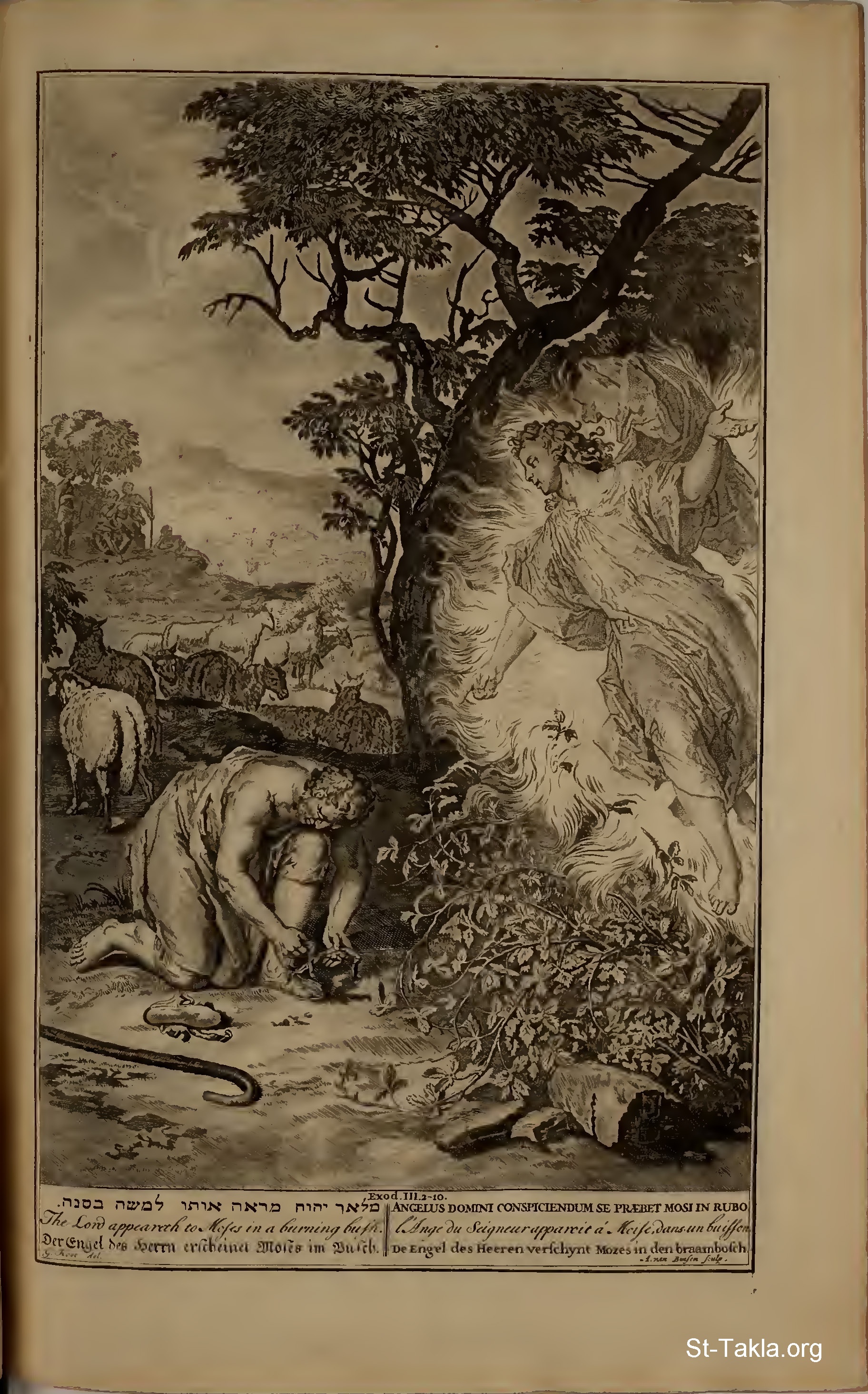 The Lord appeareth to Moses in a burning bush.: And the angel of the Lord appeared unto him in a flame of fire out of the midst of a bush: and he looked, and, behold, the bush burned with fire, and the bush was not consumed. And Moses said, I will now turn aside, and see this great sight, why the bush is not burnt. And when the Lord saw that he turned aside to see, God called unto him out of the midst of the bush, and said, Moses, Moses. And he said, Here am I. And he said, Draw not nigh hither: put off thy shoes from off thy feet, for the place whereon thou standest is holy ground. Moreover he said, I am the God of thy father, the God of Abraham, the God of Isaac, and the God of Jacob. And Moses hid his face; for he was afraid to look upon God. And the Lord said, I have surely seen the affliction of my people which are in Egypt, and have heard their cry by reason of their taskmasters; for I know their sorrows; And I am come down to deliver them out of the hand of the Egyptians, and to bring them up out of that land unto a good land and a large, unto a land flowing with milk and honey; unto the place of the Canaanites, and the Hittites, and the Amorites, and the Perizzites, and the Hivites, and the Jebusites. Now therefore, behold, the cry of the children of Israel is come unto me; and I have also seen the oppression wherewith the Egyptians oppress them. Come now therefore, and I will send thee unto Pharaoh, that thou mayest bring forth my people the children of Israel out of Egypt. (Exodus 3:2-10) - from "Figures de la Bible" book, 1728.