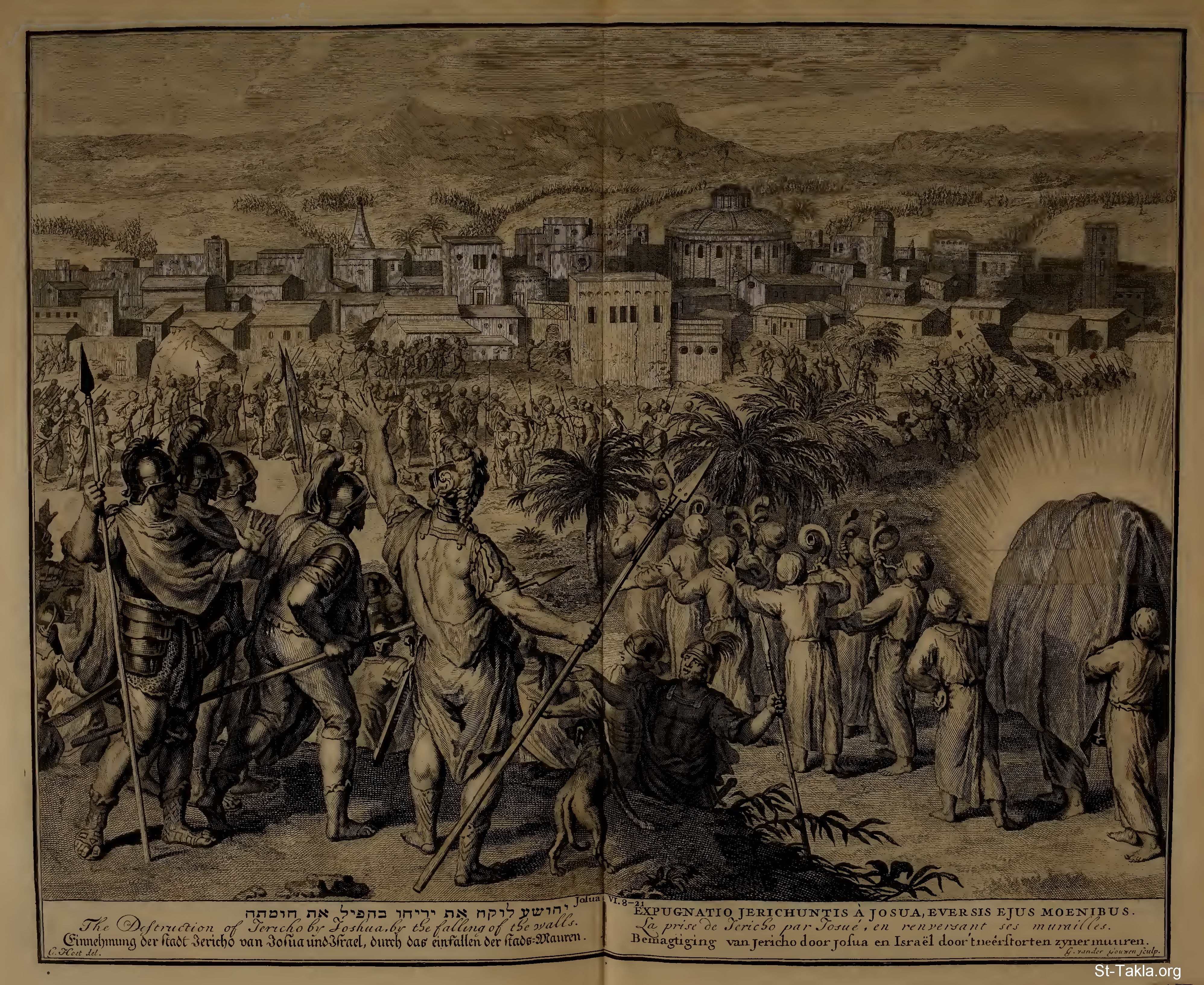 The Destruction of Jericho by Joshua, by the falling of the walls.: And Joshua had commanded the people, saying, Ye shall not shout, nor make any noise with your voice, neither shall any word proceed out of your mouth, until the day I bid you shout; then shall ye shout. So the ark of the Lord compassed the city, going about it once: and they came into the camp, and lodged in the camp. And Joshua rose early in the morning, and the priests took up the ark of the Lord. And seven priests bearing seven trumpets of rams' horns before the ark of the Lord went on continually, and blew with the trumpets: and the armed men went before them; but the rereward came after the ark of the Lord, the priests going on, and blowing with the trumpets. And the second day they compassed the city once, and returned into the camp: so they did six days. And it came to pass on the seventh day, that they rose early about the dawning of the day, and compassed the city after the same manner seven times: only on that day they compassed the city seven times. And it came to pass at the seventh time, when the priests blew with the trumpets, Joshua said unto the people, Shout; for the Lord hath given you the city. And the city shall be accursed, even it, and all that are theerin, to the Lord: only Rahab the harlot shall live, she and all that are with her in the house, because she hid the messengers that we sent... ...and it came to pass, when the people heard the sound of the trumpet, and the people shouted with a great shout, that the wall fell down flat, so that the people went up into the city, every man straight before him, and they took the city. (Joshua 6:10-17, 20b) - from "Figures de la Bible" book, 1728.