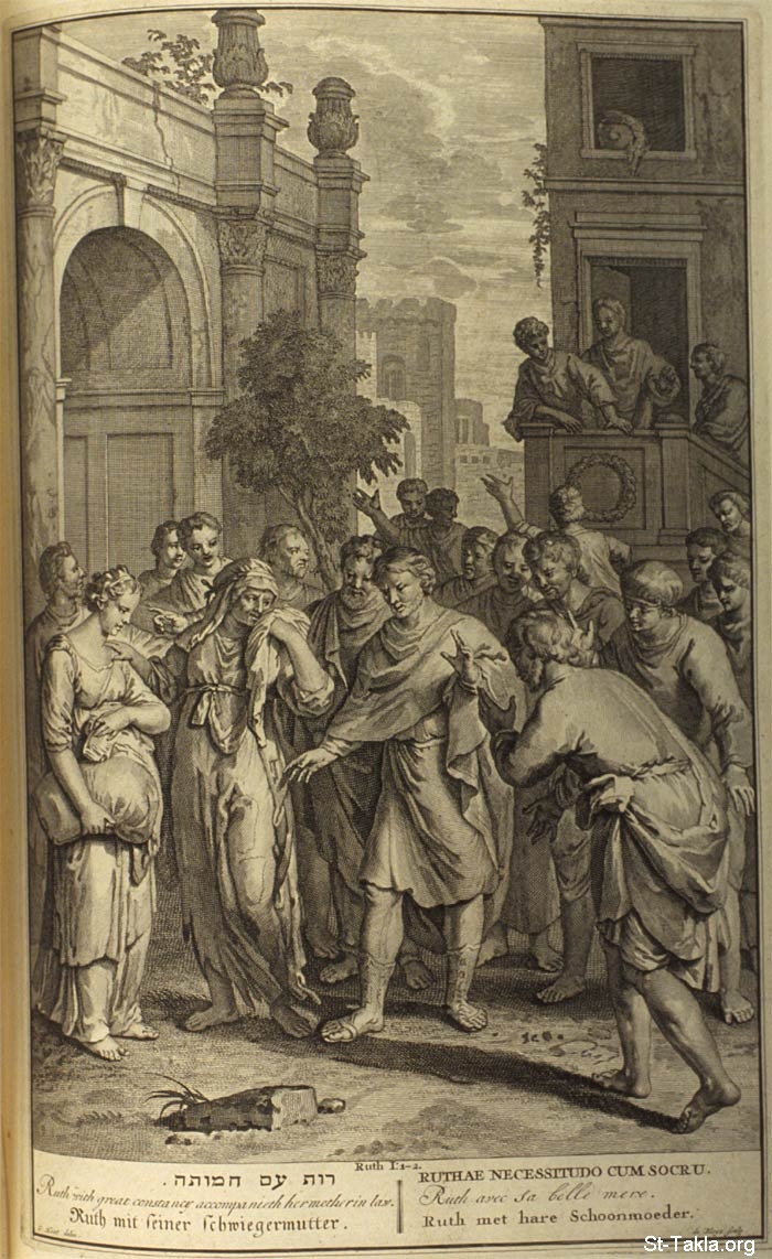Ruth with great constancy accompanieth her mother in law.: And [Naomi] said, Behold, thy sister in law is gone back unto her people, and unto her gods: return thou after thy sister in law. And Ruth said, Intreat me not to leave thee, or to return from following after thee: for whither thou goest, I will go; and where thou lodgest, I will lodge: thy people shall be my people, and thy God my God: Where thou diest, will I die, and there will I be buried: the Lord do so to me, and more also, if ought but death part thee and me. When she saw that she was stedfastly minded to go with her, then she left speaking unto her. (Ruth 1:1,2) - from "Figures de la Bible" book, 1728.