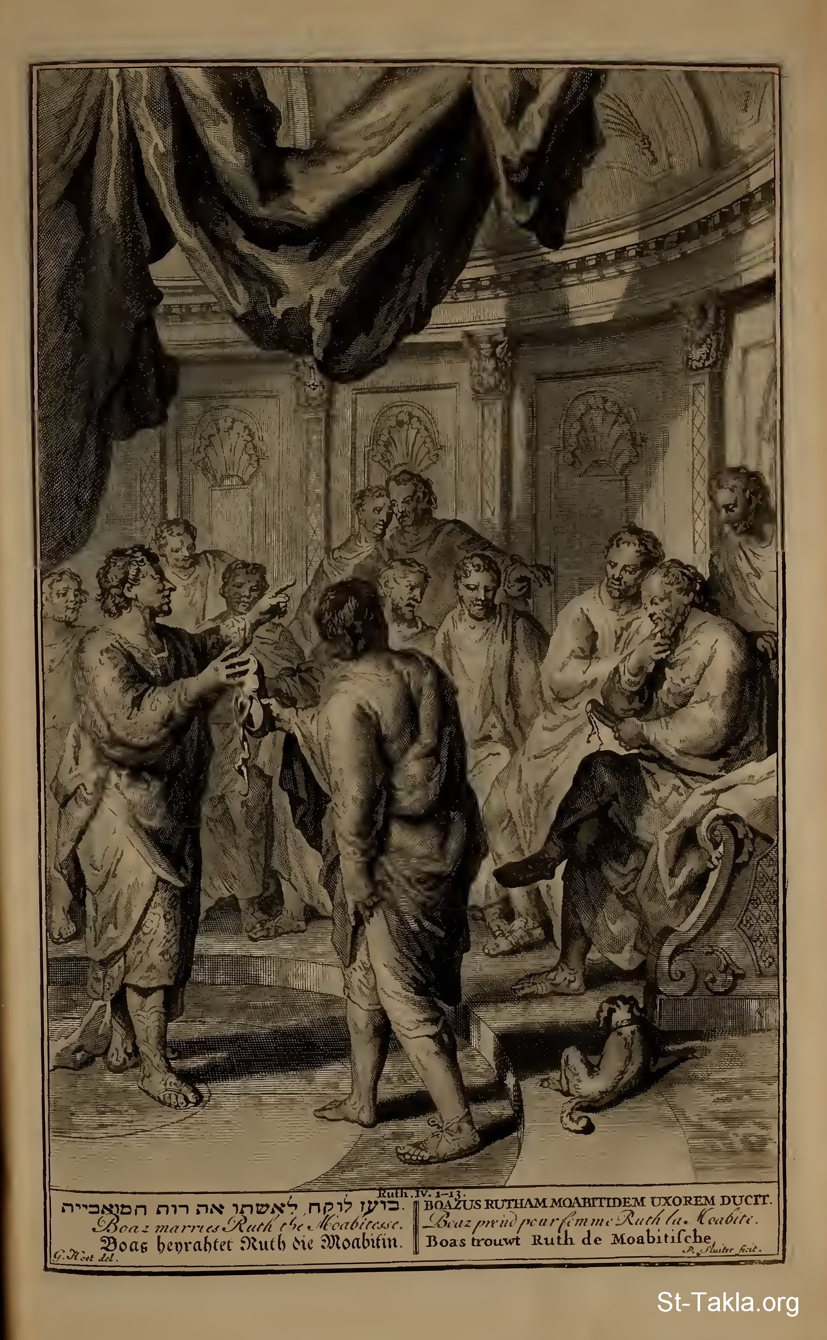 Boaz marries Ruth the Moabitesse.: Then went Boaz up to the gate, and sat him down there: and, behold, the kinsman of whom Boaz spake came by; unto whom he said, Ho, such a one! turn aside, sit down here. And he turned aside, and sat down. And he took ten men of the elders of the city, and said, Sit ye down here. And they sat down. And he said unto the kinsman, Naomi, that is come again out of the country of Moab, selleth a parcel of land, which was our brother Elimelech's: And I thought to advertise thee, saying, Buy it before the inhabitants, and before the elders of my people. If thou wilt redeem it, redeem it: but if thou wilt not redeem it, then tell me, that I may know: for there is none to redeem it beside thee; and I am after thee. And he said, I will redeem it. Then said Boaz, What day thou buyest the field of the hand of Naomi, thou must buy it also of Ruth the Moabitess, the wife of the dead, to raise up the name of the dead upon his inheritance. And the kinsman said, I cannot redeem it for myself, lest I mar mine own inheritance: redeem thou my right to thyself; for I cannot redeem it. Now this was the manner in former time in Israel concerning redeeming and concerning changing, for to confirm all things; a man plucked off his shoe, and gave it to his neighbour: and this was a testimony in Israel. Therefore the kinsman said unto Boaz, Buy it for thee. So he drew off his shoe... ...So Boaz took Ruth, and she was his wife: and when he went in unto her, the Lord gave her conception, and she bare a son. (Ruth 4:1-8,13) - from "Figures de la Bible" book, 1728.