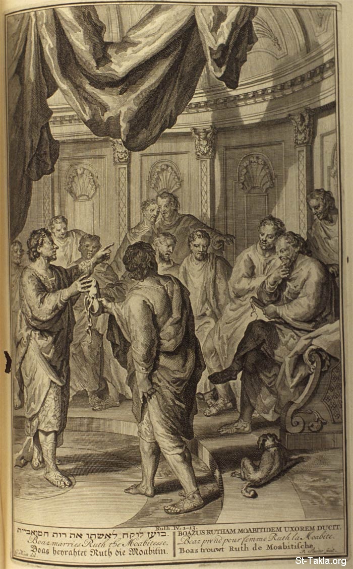 Boaz marries Ruth the Moabitesse.: Then went Boaz up to the gate, and sat him down there: and, behold, the kinsman of whom Boaz spake came by; unto whom he said, Ho, such a one! turn aside, sit down here. And he turned aside, and sat down. And he took ten men of the elders of the city, and said, Sit ye down here. And they sat down. And he said unto the kinsman, Naomi, that is come again out of the country of Moab, selleth a parcel of land, which was our brother Elimelech's: And I thought to advertise thee, saying, Buy it before the inhabitants, and before the elders of my people. If thou wilt redeem it, redeem it: but if thou wilt not redeem it, then tell me, that I may know: for there is none to redeem it beside thee; and I am after thee. And he said, I will redeem it. Then said Boaz, What day thou buyest the field of the hand of Naomi, thou must buy it also of Ruth the Moabitess, the wife of the dead, to raise up the name of the dead upon his inheritance. And the kinsman said, I cannot redeem it for myself, lest I mar mine own inheritance: redeem thou my right to thyself; for I cannot redeem it. Now this was the manner in former time in Israel concerning redeeming and concerning changing, for to confirm all things; a man plucked off his shoe, and gave it to his neighbour: and this was a testimony in Israel. Therefore the kinsman said unto Boaz, Buy it for thee. So he drew off his shoe... ...So Boaz took Ruth, and she was his wife: and when he went in unto her, the Lord gave her conception, and she bare a son. (Ruth 4:1-8,13) - from "Figures de la Bible" book, 1728.