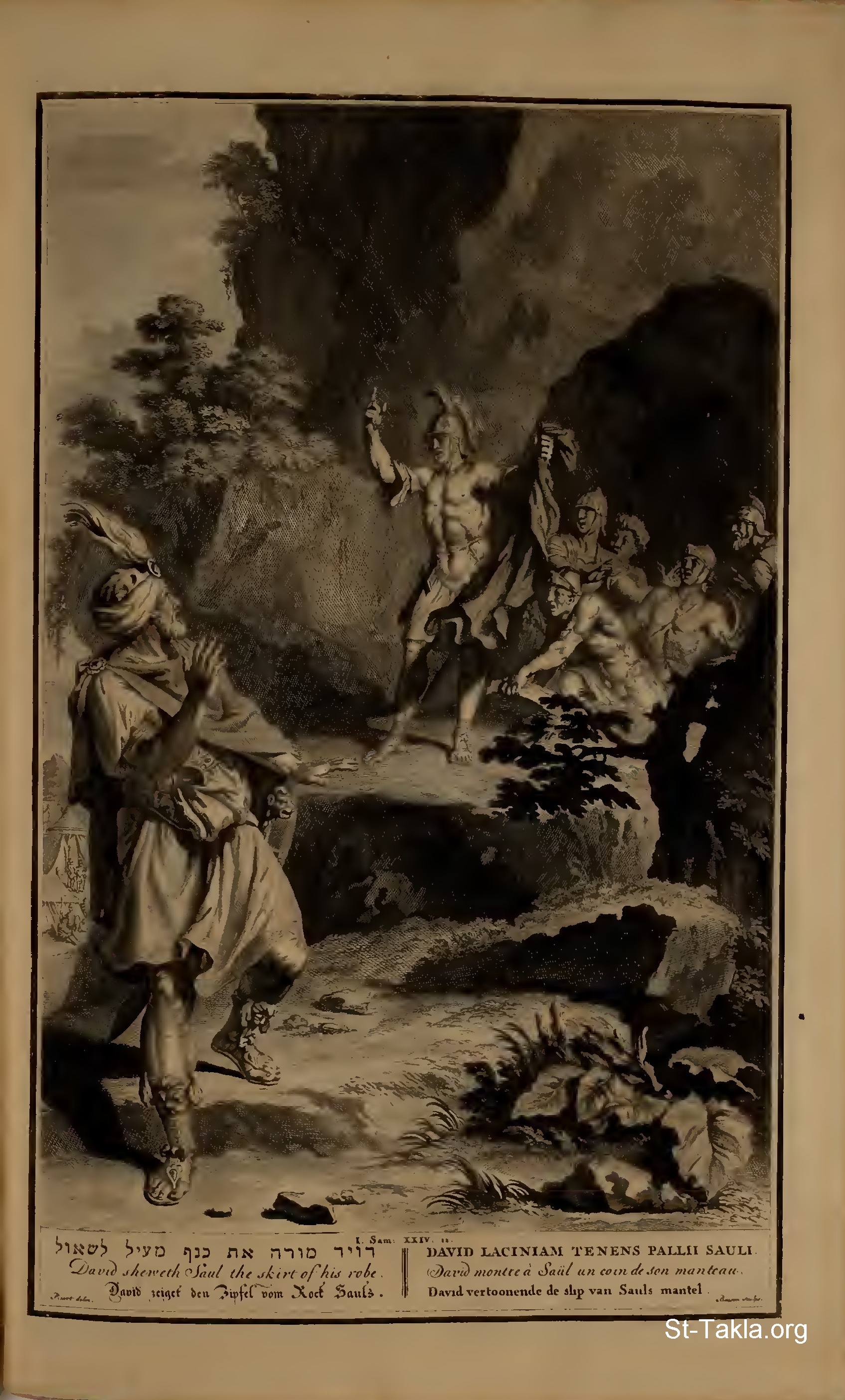 David showeth Saul the skirt of his robe.: Moreover, my father, see, yea, see the skirt of thy robe in my hand: for in that I cut off the skirt of thy robe, and killed thee not, know thou and see that there is neither evil nor transgression in mine hand, and I have not sinned against thee; yet thou huntest my soul to take it. (I Samuel 24:11) - from "Figures de la Bible" book, 1728.