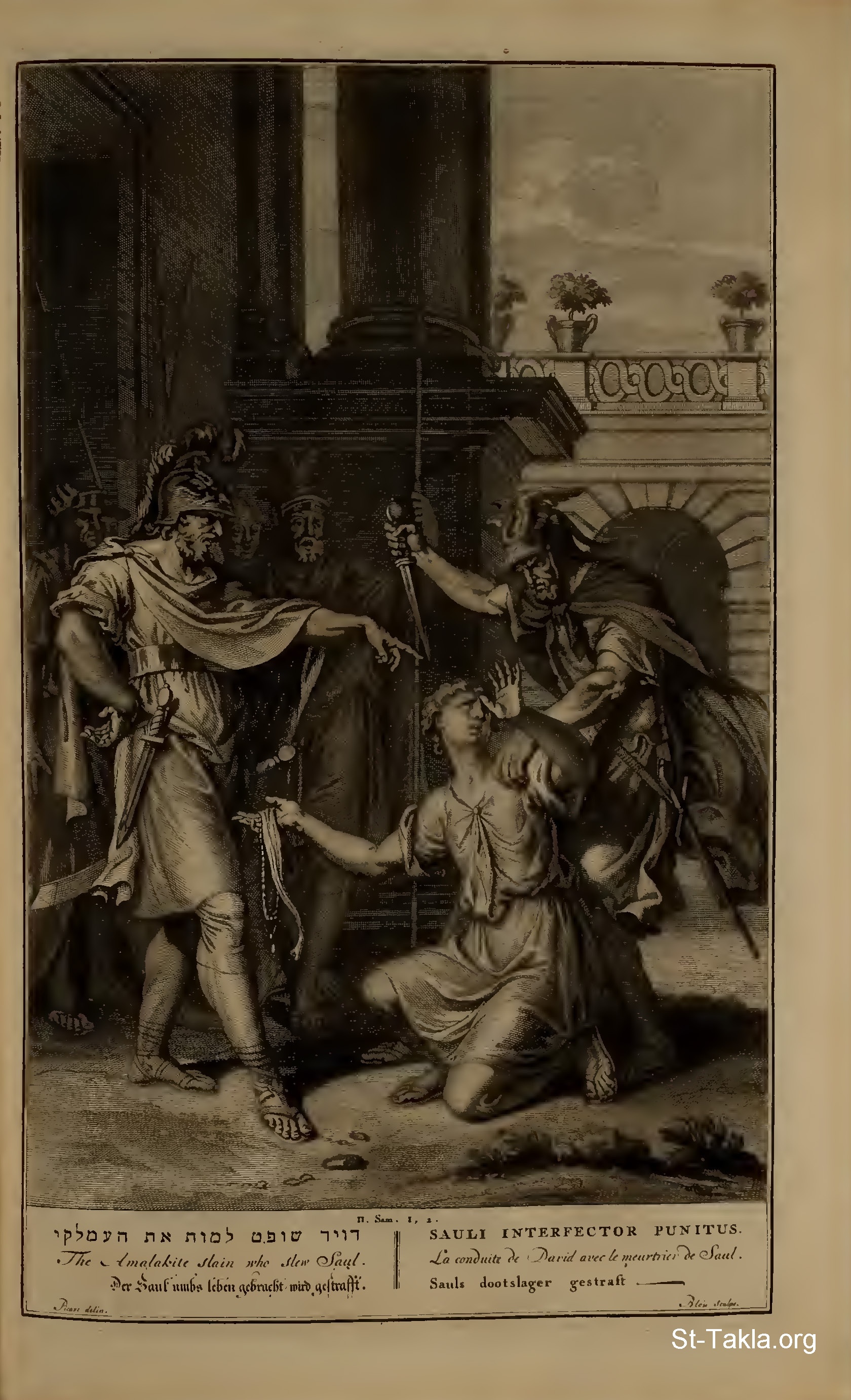 The Amalekite slain who slew Saul.: And David said unto the young man that told him, Whence art thou? And he answered, I am the son of a stranger, an Amalekite. And David said unto him, How wast thou not afraid to stretch forth thine hand to destroy the Lord's anointed? And David called one of the young men, and said, Go near, and fall upon him. And he smote him that he died. (II Samuel 1:13-15) - from "Figures de la Bible" book, 1728.