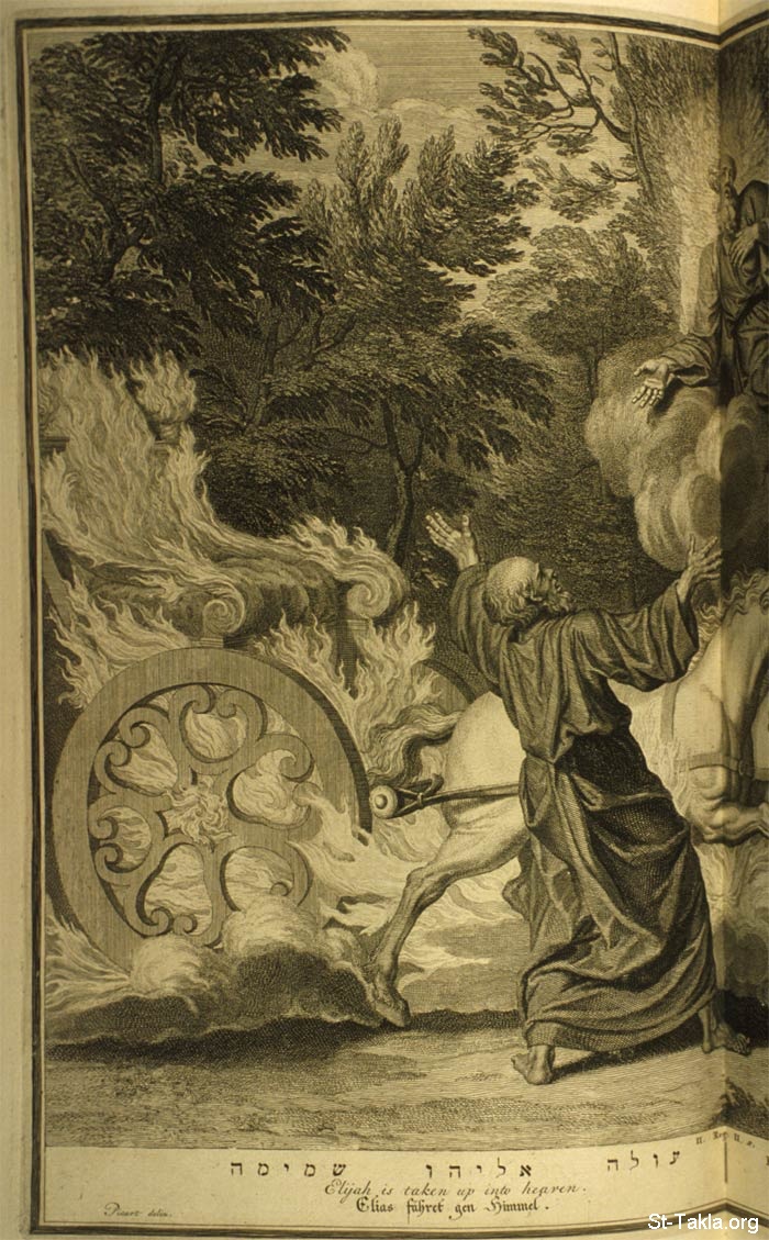 صعود إيليا النبي إلى السماء في مركبة نارية (تفاصيل 2): "وفيما هما يسيران ويتكلمان إذا مركبة من نار وخيل من نار فصلت بينهما، فصعد إيليا في العاصفة إلى السماء" (ملوك الثاني 2: 11) - من كتاب "صور كتابية"، 1728 م.