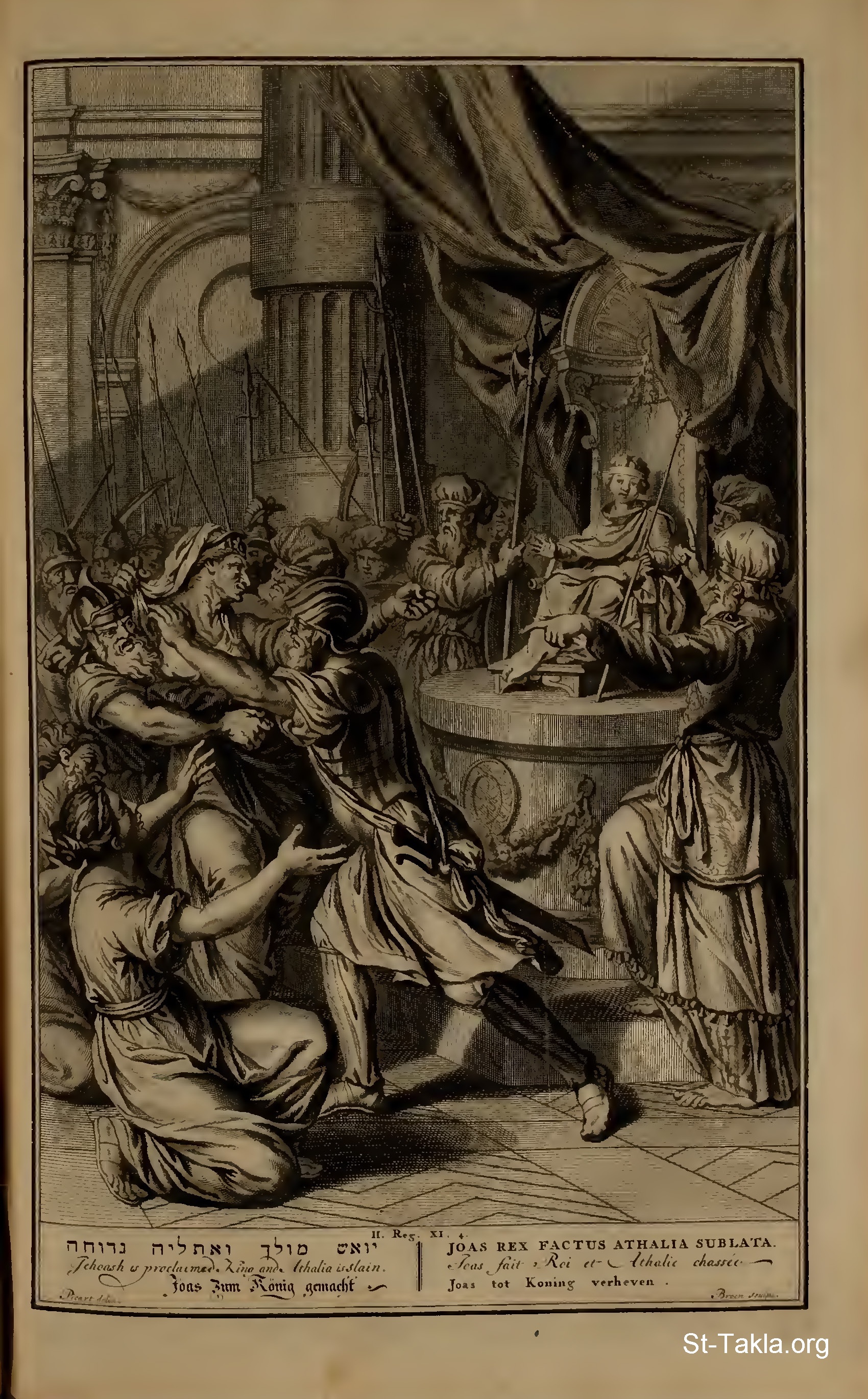 Jehoash is proclaimed King and Athalia is slain. : And he brought forth the king's son, and put the crown upon him, and gave him the testimony; and they made him king, and anointed him; and they clapped their hands, and said, God save the king. And when Athaliah heard the noise of the guard and of the people, she came to the people into the temple of the Lord. And when she looked, behold, the king stood by a pillar, as the manner was, and the princes and the trumpeters by the king, and all the people of the land rejoiced, and blew with trumpets: and Athaliah rent her clothes, and cried, Treason, Treason... ...And they laid hands on her; and she went by the way by the which the horses came into the king's house: and there was she slain. (II Kings 11:12-14,16) - from "Figures de la Bible" book, 1728.