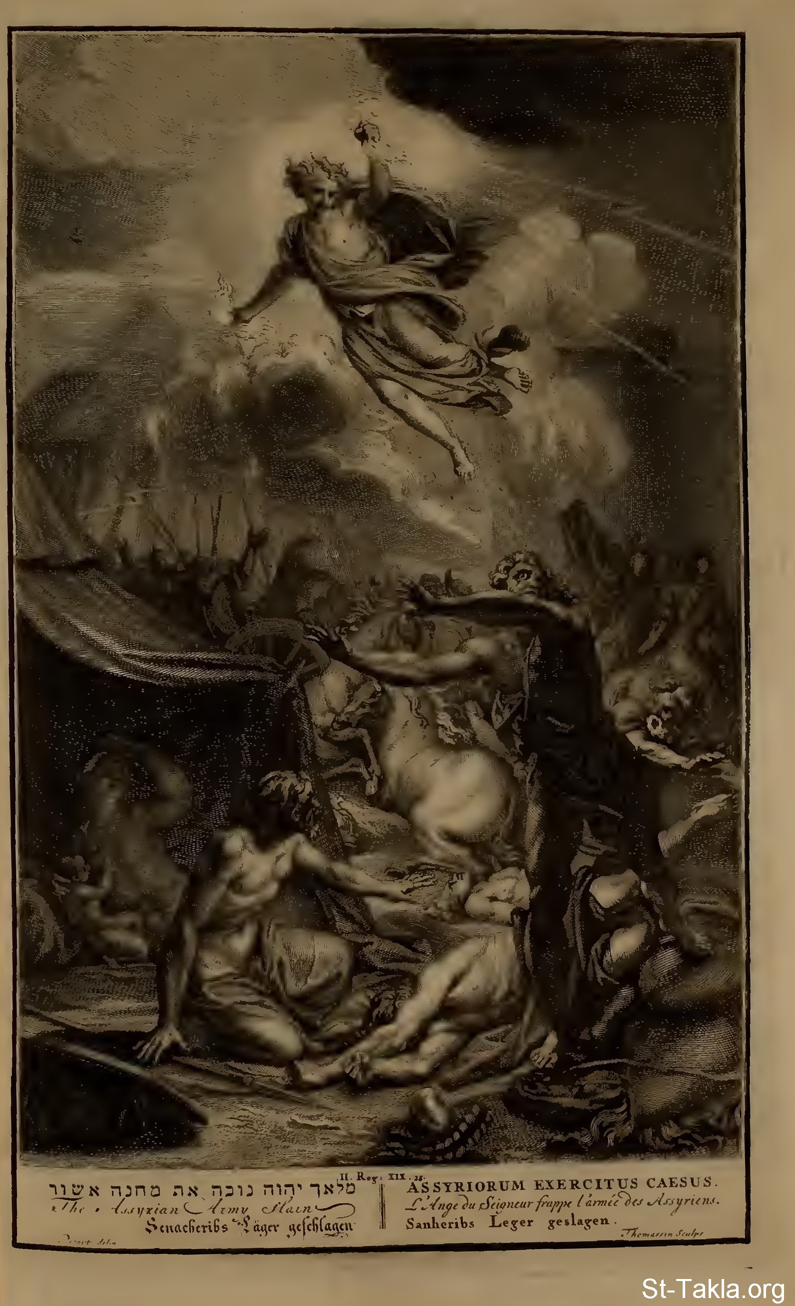 The Assyrian Army slain. : And it came to pass that night, that the angel of the Lord went out, and smote in the camp of the Assyrians an hundred fourscore and five thousand: and when they arose early in the morning, behold, they were all dead corpses. (II Kings 19:35) - from "Figures de la Bible" book, 1728.