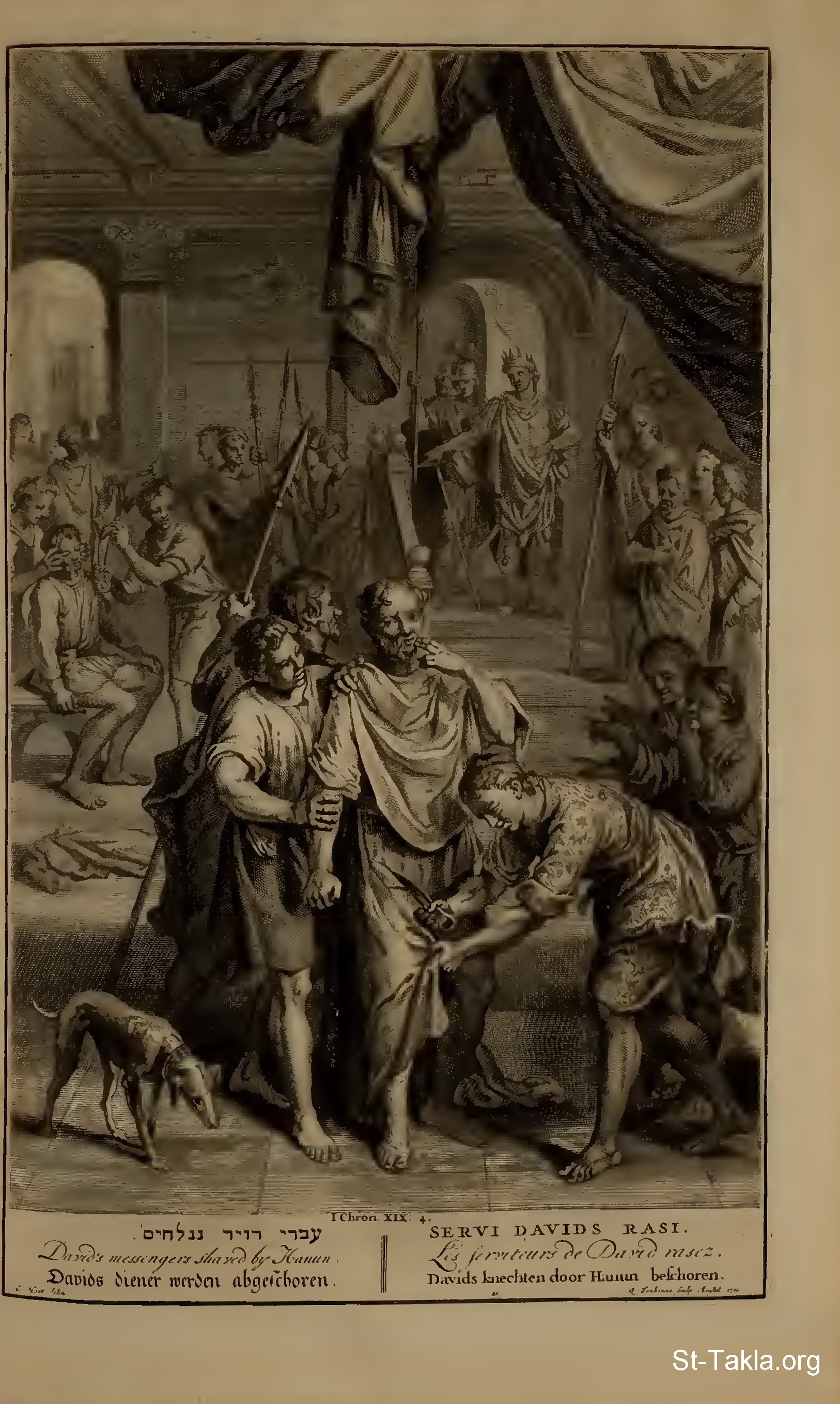David's messengers shaved by Hanun. : Wherefore Hanun took David's servants, and shaved them, and cut off their garments in the midst hard by their buttocks, and sent them away. (I Chronicles 19:4) - from "Figures de la Bible" book, 1728.