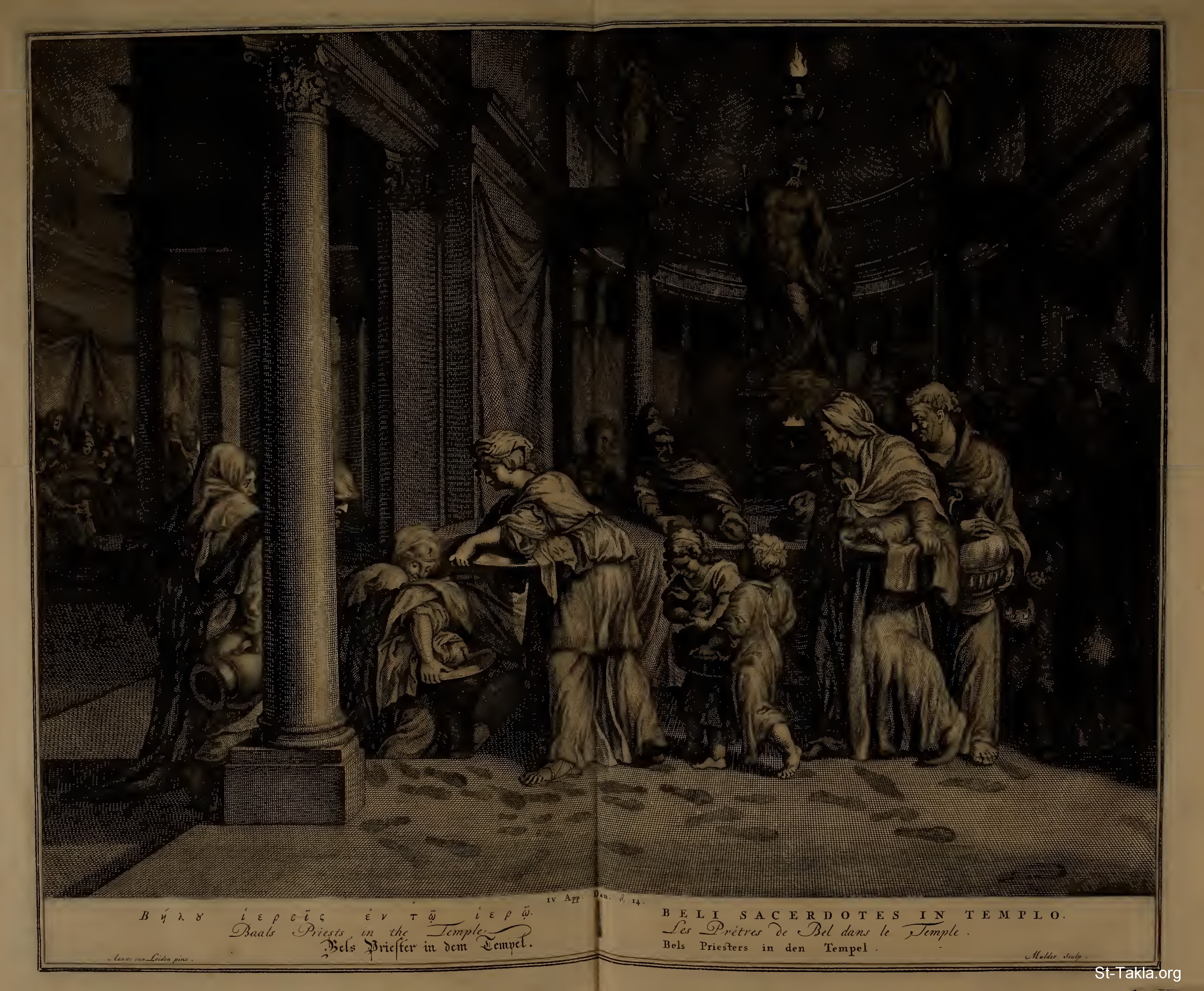 Baals priests, in the temple. : Now there were seventy priests of Bel, besides their wives and children. And the king went with Daniel into the temple of Bel. And the priests of Bel said, "Behold, we are going outside; you yourself, O king, shall set forth the food and mix and place the wine, and shut the door and seal it with your signet. And when you return in the morning, if you do not find that Bel has eaten it all, we will die; or else Daniel will, who is telling lies about us." They were unconcerned, for beneath the table they had made a hidden entrance, through which they used to go in regularly and consume the provisions. When they had gone out, the king set forth the food for Bel. Then Daniel ordered his servants to bring ashes and they sifted them throughout the whole temple in the presence of the king alone. Then they went out, shut the door and sealed it with the king's signet, and departed. In the night the priests came with their wives and children, as they were accustomed to do, and ate and drank everything. (Bel 1:10-15) (RSV) - from "Figures de la Bible" book, 1728.