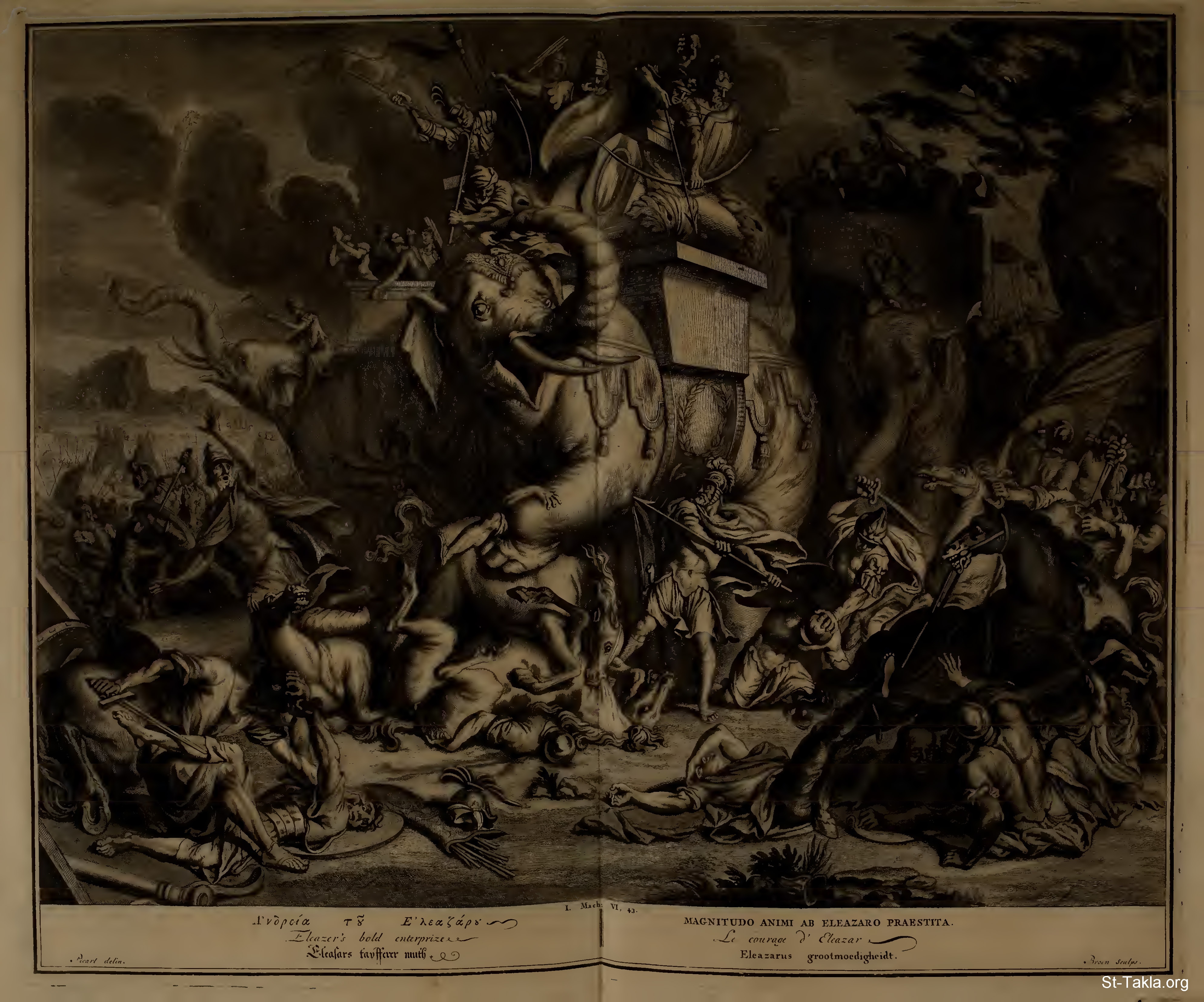 Eleazar's bold enterprise. : And Eleazar, called Avaran, saw that one of the beasts was equipped with royal armor. It was taller than all the others, and he supposed that the king was upon it. So he gave his life to save his people and to win for himself an everlasting name. He courageously ran into the midst of the phalanx to reach it; he killed men right and left, and they parted before him on both sides. He got under the elephant, stabbed it from beneath, and killed it; but it fell to the ground upon him and he died. (I Maccabees 6:43-46) (RSV) - from "Figures de la Bible" book, 1728.