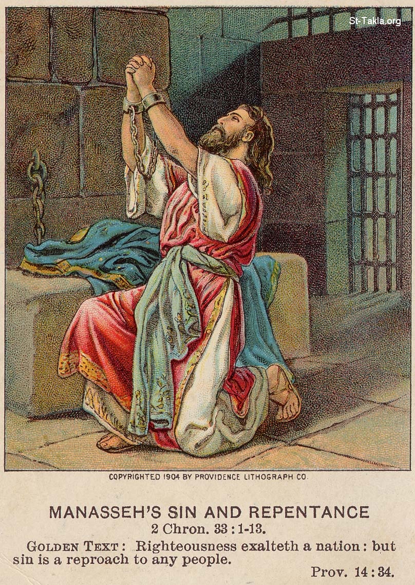 خطية منسى وتوبته (أخبار الأيام الثانية 33: 1-13): البر يرفع شأن الأمة، وعار الشعوب الخطية (أمثال 14: 34) - من صور الإنجيل من شركة بروفيدينس المطبوعة حجريًا.
