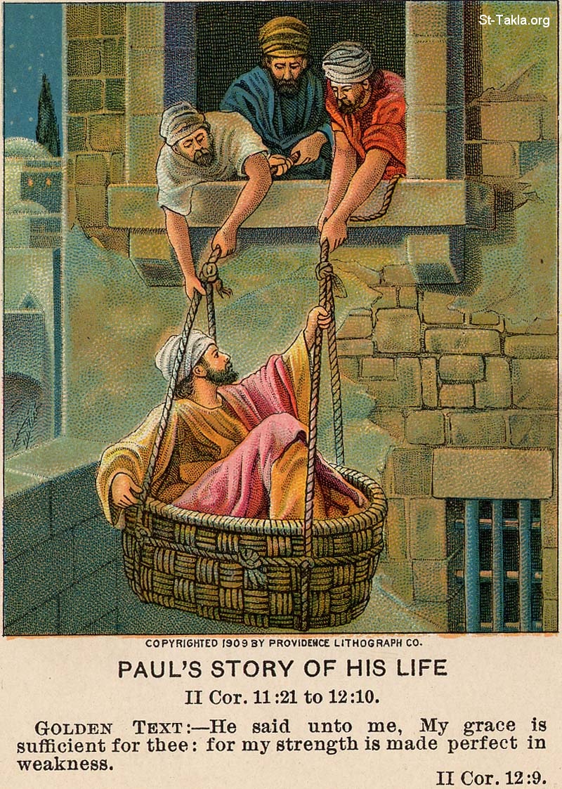 رواية بولس لقصة حياته: "في دمشق، والي الحارث الملك كان يحرس مدينة الدمشقيين، يريد أن يمسكني، فتدليت من طاقة في زنبيل من السور، ونجوت من يديه." (كورنثوس الثانية 11: 32-33) - "«تكفيك نعمتي، لأن قوتي في الضعف تكمل». فبكل سرور أفتخر بالحري في ضعفاتي، لكي تحل علي قوة المسيح" (كورنثوس الثانية 12: 9). - من صور الإنجيل من شركة بروفيدينس المطبوعة حجريًا.